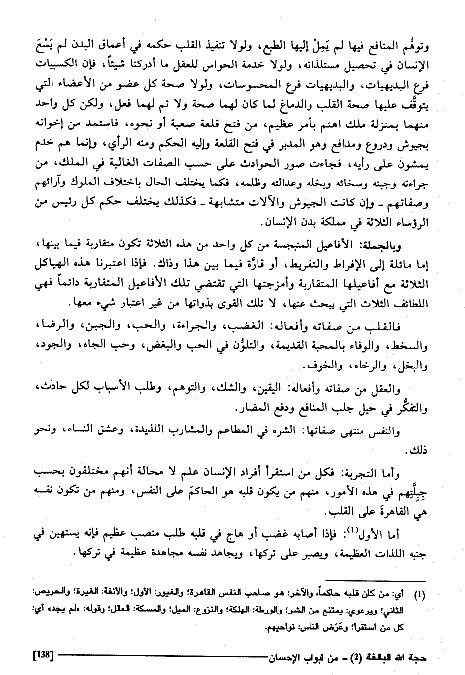 وتوهم الْمَنَافِع فِيهَا لم يمل إِلَيْهَا الطَّبْع، وَلَوْلَا تَنْفِيذ الْقلب حكمه فِي أعماق الْبدن لم يسع الْإِنْسَان فِي تَحْصِيل مستلذاته، وَلَوْلَا خدمَة