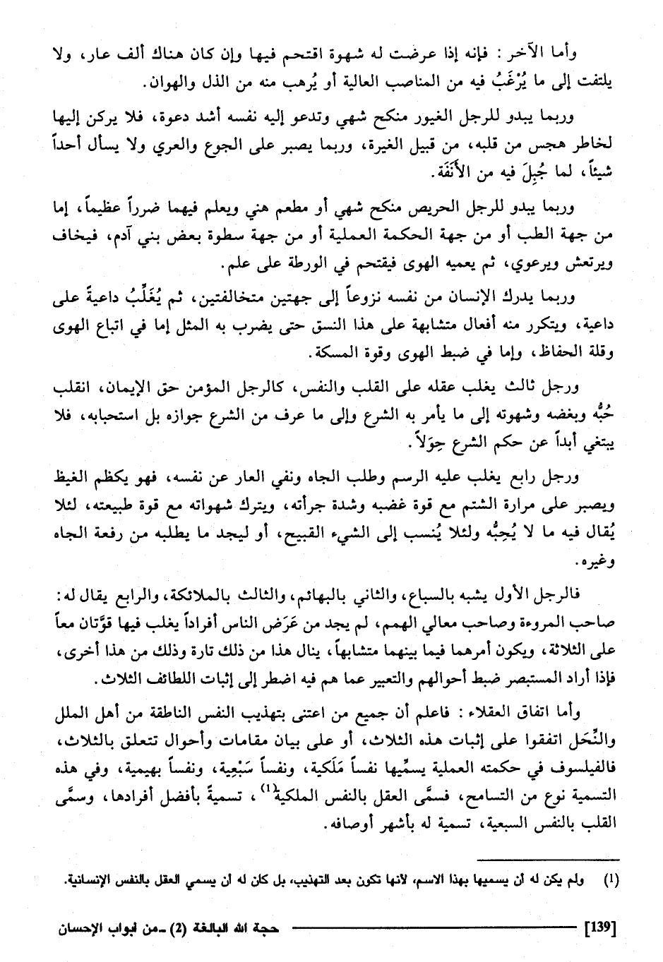 وَأما اتِّفَاق الْعُقَلَاء فَاعْلَم أَن جَمِيع من اعتنى بتهذيب النَّفس الناطقة من أهل الْملَل والنحل اتَّفقُوا على إِثْبَات هَذِه الثَّلَاث أَو على بَيَان مقامات وأحوال تتَعَلَّق بِالثلَاثِ، فالفيلسوف فِي حكمته العملية يسميها نفسا ملكية، ونفسا سبعية، ونفسا بهيمية، وَفِي هَذِه التَّسْمِيَة نوع من التسامح، فَسمى الْعقل بِالنَّفسِ الملكية تَسْمِيَة بِأَفْضَل أفرادها، وسمى الْقلب بِالنَّفسِ السبعية تَسْمِيَة لَهُ بأشهر صافه.