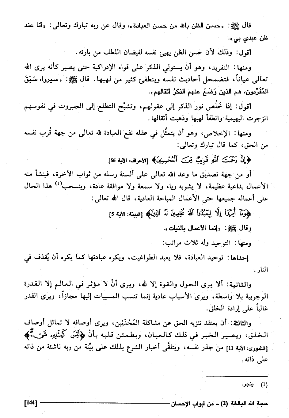 قَالَ صَلَّى اللهُ عَلَيْهِ وَسَلَّمَ: " حسن الظَّن بِاللَّه من حسن الْعِبَادَة " وَقَالَ عَن ربه تبَارك وَتَعَالَى: (أَنا عِنْد ظن عَبدِي بِي) أَقُول: وَذَلِكَ لِأَن حسن الظَّن يُهَيِّئ نَفسه لفيضان اللطف من بارئه.