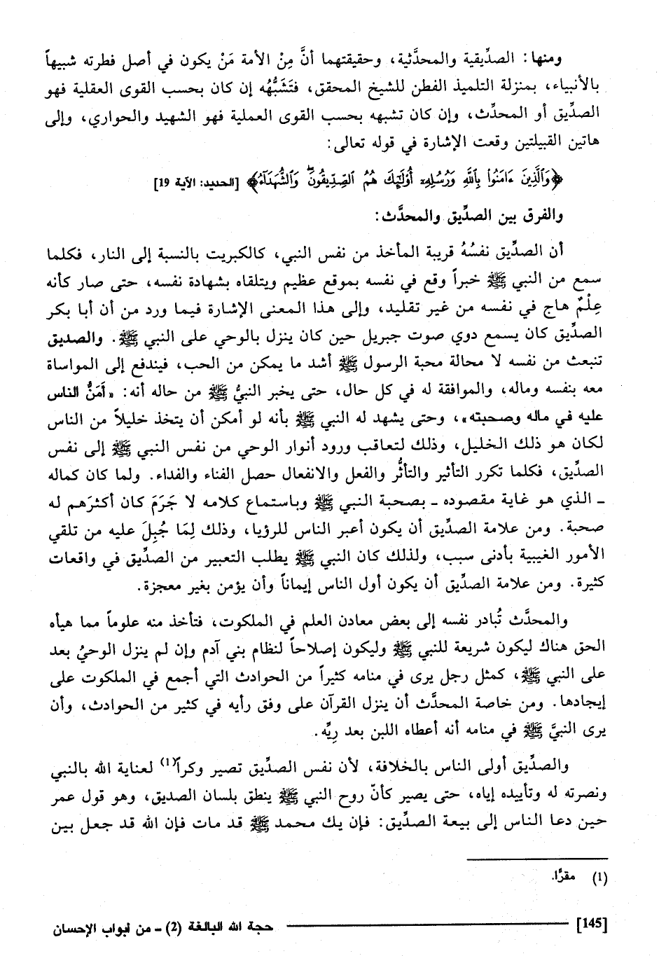 وَمِنْهَا الصديقية، والمحدثية، وحقيقتها أَن من الْأمة من يكون فِي أصل فطرته شَبِيها بالأنبياء بِمَنْزِلَة التلميذ الفطن للشَّيْخ الْمُحَقق، فتشبهه إِن كَانَ بِحَسب القوى الْعَقْلِيَّة فَهُوَ الصّديق أَو الْمُحدث، وَإِن كَانَ تشبهه بِحَسب الْقود العملية فَهُوَ الشَّهِيد والحواري، وَإِلَى هَاتين القبيلتين وَقعت الْإِشَارَة فِي قَوْله تَعَالَى: