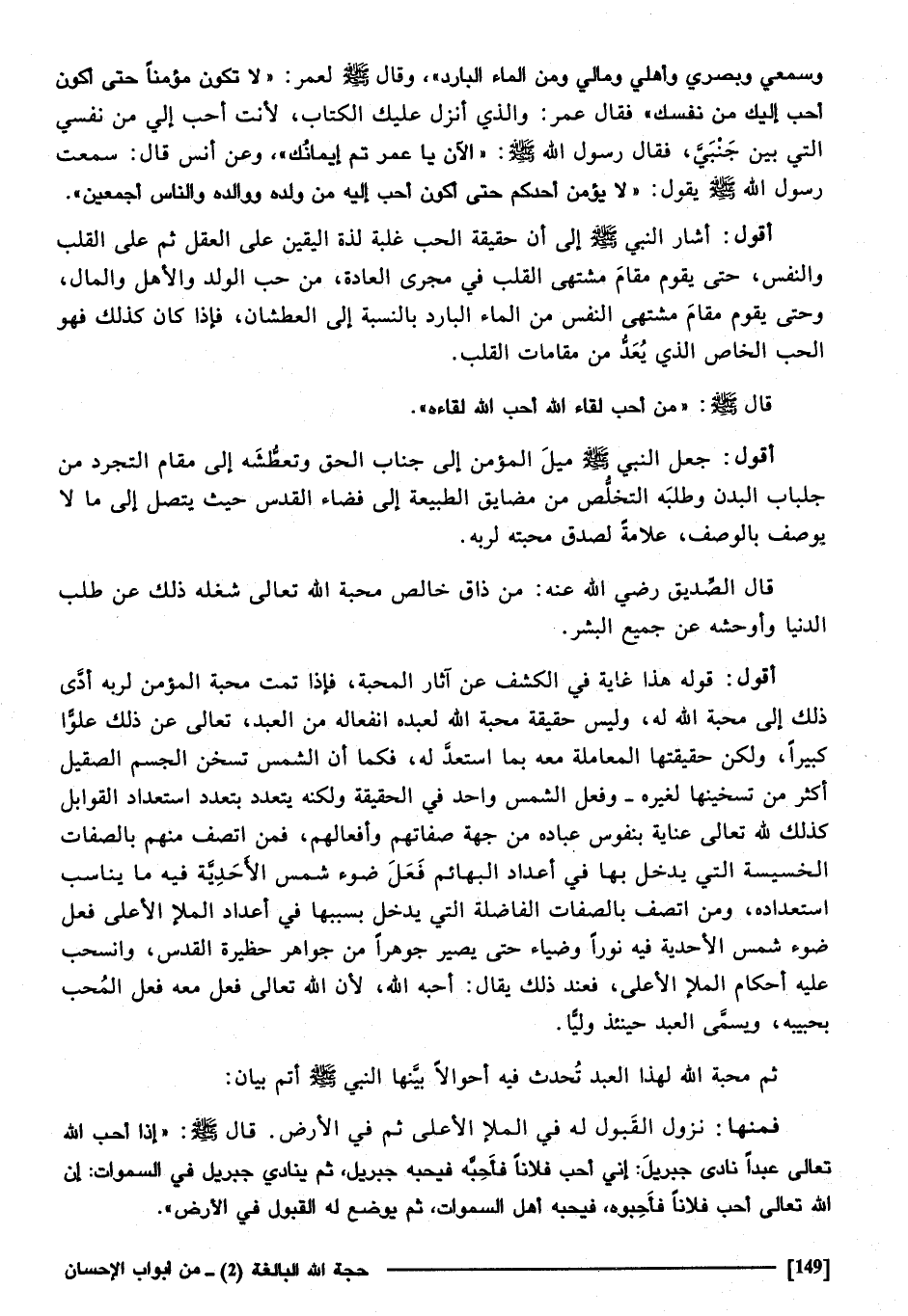 أَقُول: أَشَارَ إِلَى النَّبِي صَلَّى اللهُ عَلَيْهِ وَسَلَّمَ أَن حَقِيقَة الْحبّ غَلَبَة لَذَّة الْيَقِين على الْعقل ثمَّ على الْقلب وَالنَّفس حَتَّى يقوم مقَام مشتهى الْقلب فِي مجْرى