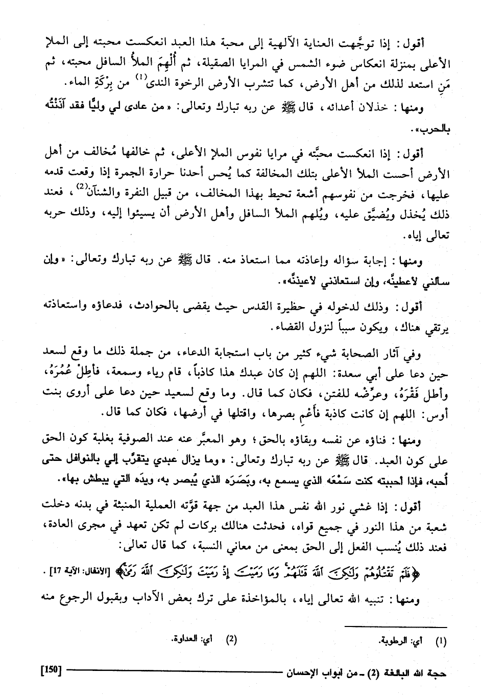 كَون الْحق على كَون العَبْد، قَالَ صَلَّى اللهُ عَلَيْهِ وَسَلَّمَ عَن ربه تبَارك وَتَعَالَى. " وَمَا يزَال عَبدِي يتَقرَّب إِلَيّ بالنوافل حَتَّى أحبه فَإِذا أحببته كنت سَمعه الَّذِي يسمع بِهِ وبصره الَّذِي يبصر بِهِ وَيَده الَّتِي يبطش بهَا " أَقُول: إِذا غشى نور الله نفس هَذَا العَبْد من جِهَة قوته العملية المنبثة فِي بدنه دخلت شُعْبَة من هَذَا النُّور فِي جَمِيع قوامه، فَحدثت هُنَالك بَرَكَات لم تكن تعهد فِي مجْرى الْعَادة، فَعِنْدَ ذَلِك ينْسب الْفِعْل إِلَى الْحق بِمَعْنى من مَعَاني النِّسْبَة كَمَا قَالَ تَعَالَى: