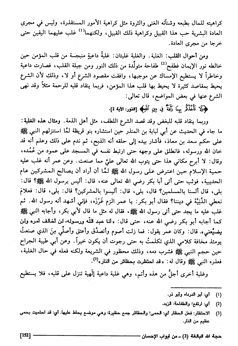 وَمن أَحْوَال الْقلب الْغَلَبَة، وَالْغَلَبَة غلبتان: غَلَبَة دَاعِيَة منبجسة من قلب الْمُؤمن حِين خالطه نور الْإِيمَان، فطفح طفاحة مُتَوَلّدَة من ذَلِك النُّور وَمن جبلة الْقلب، فَصَارَت داعيه وخاطرا لَا يَسْتَطِيع الْإِمْسَاك عَن مُوجبهَا وَافَقت مَقْصُود الشَّرْع أَو لَا، وَذَلِكَ لِأَن الشَّرْع يُحِيط بمقاصد كَثِيرَة لَا يُحِيط بهَا قلب هَذَا الْمُؤمن فَرُبمَا ينقاد قلبه إِلَى للرحمة مثلا، وَقد نهى الشَّرْع عَنْهَا فِي بعض الْمَوَاضِع، قَالَ تَعَالَى: