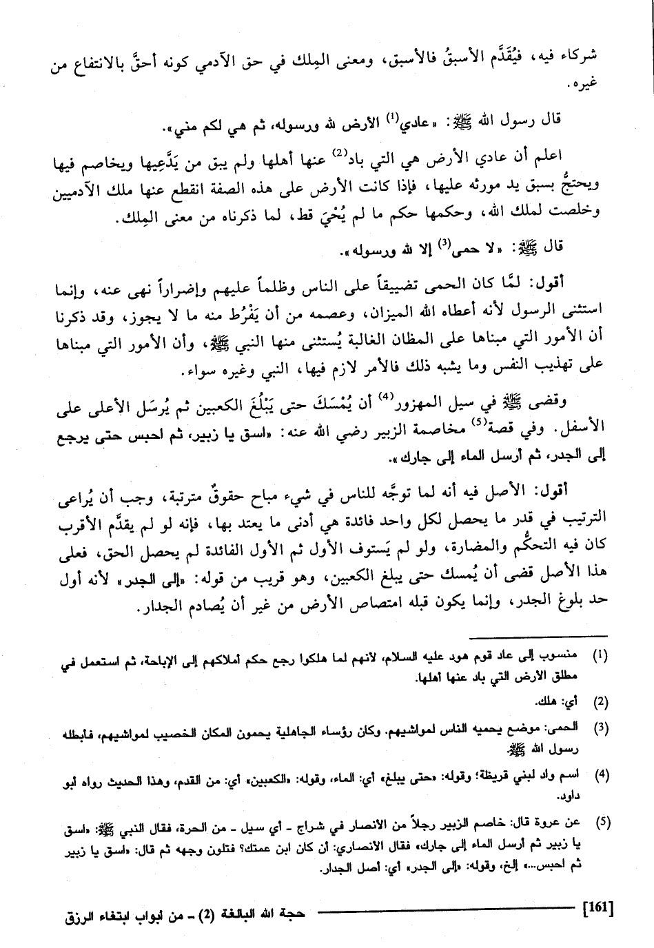 الْكَعْبَيْنِ ثمَّ يُرْسل الْأَعْلَى على الْأَسْفَل، وَفِي قصَّة مخاصمة الزبير رَضِي الله عَنهُ " اسْقِ يَا زبير، ثمَّ احْبِسْ حَتَّى يرجع إِلَى الْجدر، ثمَّ أرسل المَاء إِلَى جَارك ". أقو ل: الأَصْل فِيهِ أَنه لما توجه للنَّاس فِي شَيْء مُبَاح حُقُوق مترتبة وَجب أَن يُرَاعِي التَّرْتِيب فِي قدر مَا يحصل لكل وَاحِد فَائِدَة هِيَ أدنى مَا يعْتد بهَا فَإِنَّهُ لَو لم يقدم الْأَقْرَب كَانَ فِيهِ التحكم والمضارة، وَلَو لم يسْتَوْف الأول ثمَّ الأول الْفَائِدَة لم يحصل الْحق، فعلى هَذَا الأَصْل قضى أَن يمسك حَتَّى يبلغ الْكَعْبَيْنِ، وَهُوَ قريب من قَوْله: " إِلَى الْجدر " لِأَنَّهُ أول حد بُلُوغ الْجدر، وَإِنَّمَا يكون قبله امتصاص الأَرْض من غير أَن يصادم الْجِدَار.