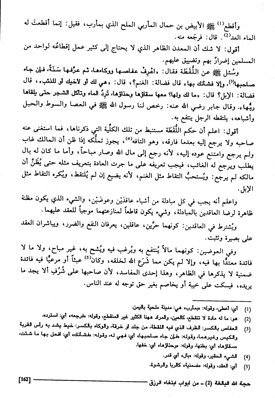فَقَالَ: هِيَ لَك أَو لأخيك أَو للذئب، قَالَ فضَالة: الْإِبِل قَالَ: مَالك وَلها مَعهَا سقاؤها وحذلؤها ترد المَاء وتأكل الشّجر حَتَّى يلقاها رَبهَا " وَقَالَ جَابر رَضِي الله عَنهُ: رخص لنا رَسُول الله صَلَّى اللهُ عَلَيْهِ وَسَلَّمَ فِي الْعَصَا وَالسَّوْط وَالْحَبل وأشباهه يلتقطه الرجل ينْتَفع بِهِ أَقُول اعْلَم أَن حكم اللّقطَة مستنبط من تِلْكَ الْكُلية الَّتِي ذَكرنَاهَا فَمَا اسْتغنى عَنهُ صَاحبه، وَلَا يرجع إِلَيْهِ بعد مَا فَارقه، وَهُوَ التافه يجوز تملكه إِذا ظن أَن الْمَالِك غَابَ، وَلم يرجع، وَامْتنع عوده إِلَيْهِ، لِأَنَّهُ رَجَعَ إِلَى مَال الله وَصَارَ مُبَاحا، وَأما مَا كَانَ لَهُ بَال يطْلب، وَيرجع لَهُ الْغَائِب، فَيجب تَعْرِيفه على مَا جرت الْعَادة بتعريف مثله حَتَّى يظنّ أَن مَالِكه لم يرجع، وَيسْتَحب الْتِقَاط مثل الْغنم لِأَنَّهُ يضيع إِن لم يلتقط، وَيكرهُ الْتِقَاط مثل الْإِبِل.