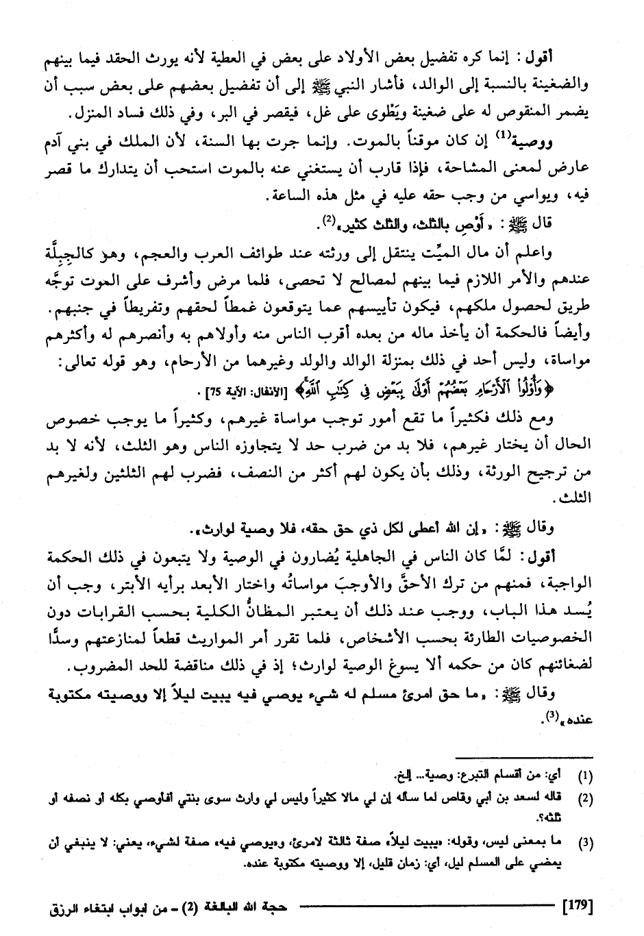 " إِن الله أعْطى لكل ذِي حق حَقه، فَلَا وَصِيَّة لوَارث. أَقُول: لما كَانَ النَّاس فِي الْجَاهِلِيَّة يضارون فِي الْوَصِيَّة، وَلَا يتبعُون فِي ذَلِك الْحِكْمَة الْوَاجِبَة، فَمنهمْ من ترك الْحق والأوجب سواساته، وَاخْتَارَ الْأَبْعَد بِرَأْيهِ الأبتر. وَجب أَن يسد هَذَا الْبَاب، وَوَجَب عِنْد ذَلِك أَن يعْتَبر المظان الْكُلية بِحَسب الْقرَابَات دون الخصوصيات الطارئة بِحَسب الْأَشْخَاص، فَلَمَّا تقرر أَمر الْمَوَارِيث قطعا لمنازعتهم وسدا لضغائنهم كَانَ من حكمه أَلا يسوغ الْوَصِيَّة لوَارث؛ إِذْ فِي ذَلِك مناقضة للحد الْمَضْرُوب.