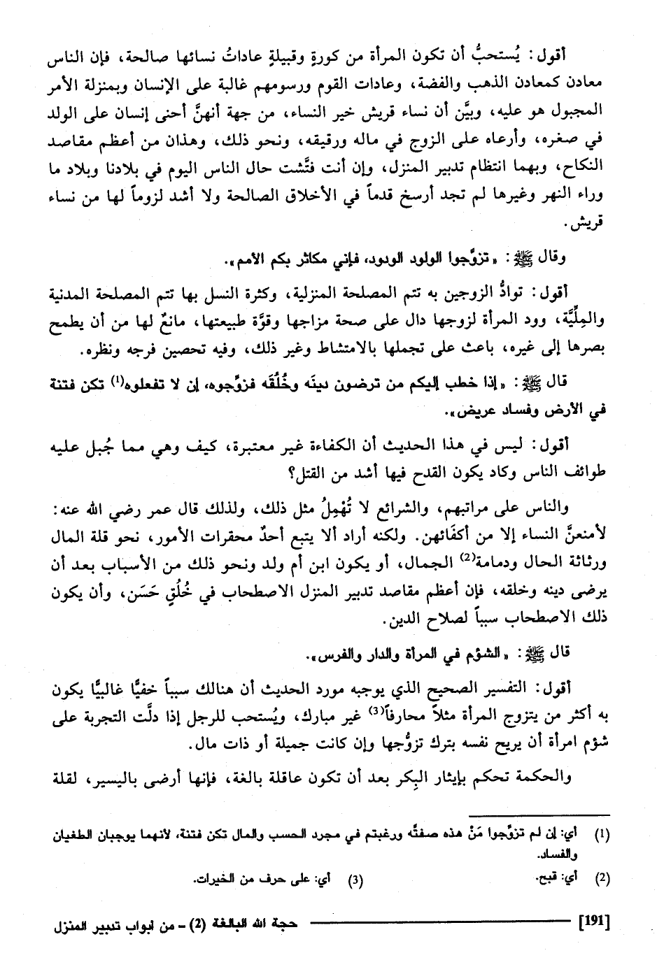" إِذا خطب إِلَيْكُم من ترْضونَ دينه وخلقه فَزَوجُوهُ إِن لَا تَفعلُوا تكن فتْنَة فِي الأَرْض وَفَسَاد عريض " أَقُول. لَيْسَ فِي هَذَا الحَدِيث أَن الْكَفَاءَة غير مُعْتَبرَة، كَيفَ وَهِي مِمَّا جبل عَلَيْهِ طوائف النَّاس، وَكَاد يكون الْقدح فِيهَا اشد من الْقَتْل، وَالنَّاس على مَرَاتِبهمْ والشرائع لَا تهمل مثل ذَلِك وَلذَلِك قَالَ عمر رَضِي الله عَنهُ: لأمنعن النِّسَاء إِلَّا من أكفائهن، وَلكنه أَرَادَ أَلا يتبع أحد محقرات الْأُمُور نَحْو قلَّة المَال ورثاثة الْحَال ودمامة الْجمال، أَو يكون ابْن أم ولد وَنَحْو ذَلِك من الْأَسْبَاب بعد أَن يرضى دينه وخلقه، فَإِن اعظم مَقَاصِد تَدْبِير الْمنزل الاصطحاب