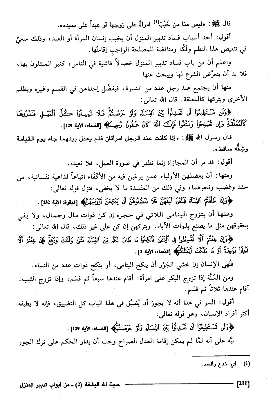 وَاعْلَم أَن بَاب فَسَاد تَدْبِير الْمنزل خِصَالًا فَاشِية فِي النَّاس، كثيرا المبتلون بهَا، فَلَا بُد أَن يتَعَرَّض الشَّرْع لَهَا، ويبحث عَنْهَا، مِنْهَا أَن يجْتَمع عِنْد رجل عدد من النسْوَة، فيفضل إِحْدَاهُنَّ فِي الْقسم وَغَيره، وَيظْلم الآخرى وَيَتْرُكهَا كالمعلقة قَالَ الله تَعَالَى: