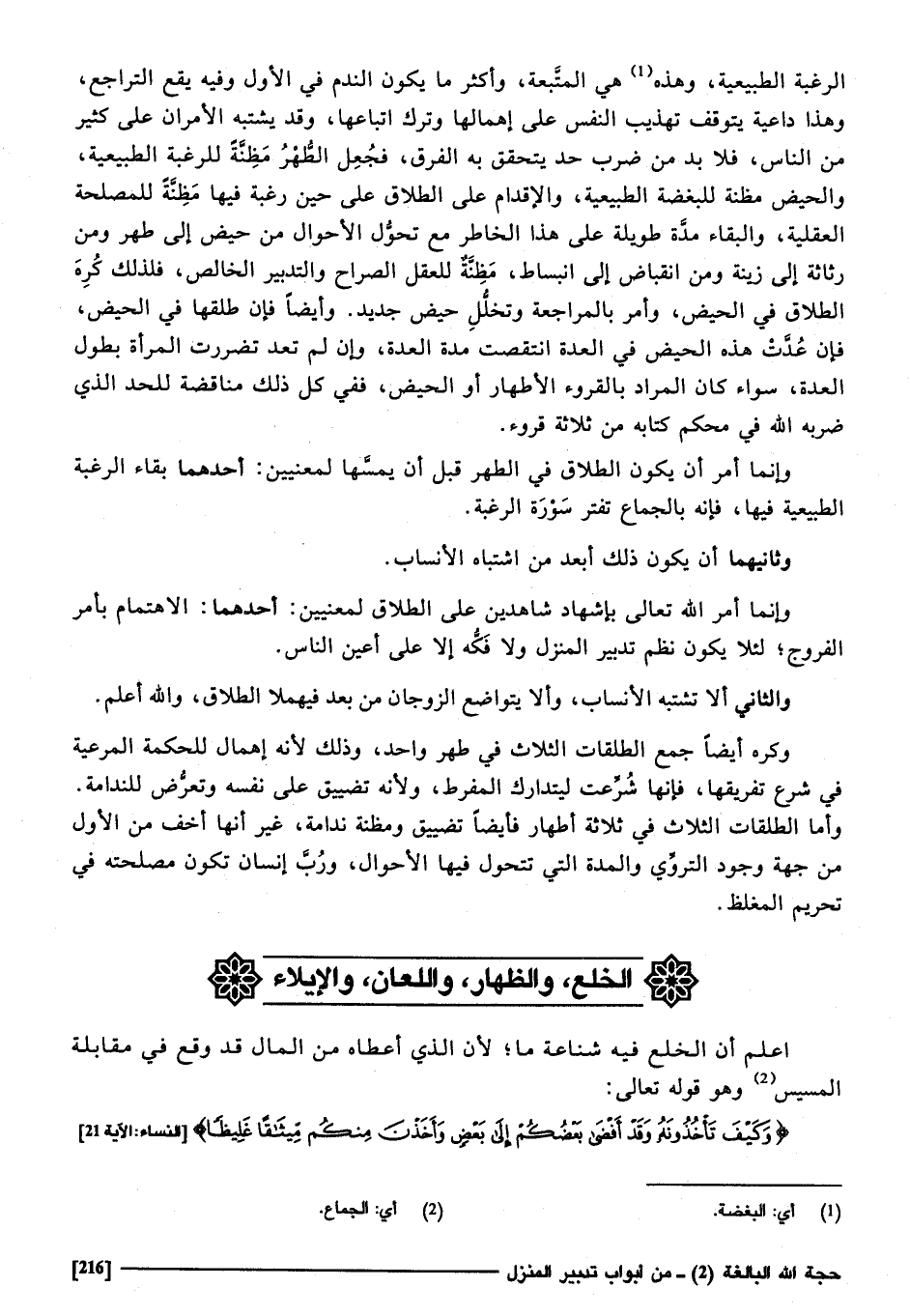 الرَّغْبَة الطبيعية، وَهَذِه هِيَ المتبعة وَأكْثر مَا يكون النَّدَم فِي الأول وَفِيه يَقع التراجع، وَهَذَا دَاعِيَة يتَوَقَّف تَهْذِيب النَّفس على إهمالها وَترك اتباعها، وَقد يشْتَبه الْأَمْرَانِ على كثير من النَّاس، فَلَا بُد من ضرب حد يتَحَقَّق بِهِ الْفرق، فَجعل الطُّهْر مَظَنَّة للرغبة الطبيعية، وَالْحيض مَظَنَّة للبغضة الطبيعية، والأقدام على الطَّلَاق على حِين رَغْبَة فِيهَا مَظَنَّة للْمصْلحَة الْعَقْلِيَّة،، والبقاء مُدَّة طَوِيلَة على هَذَا الخاطر مَعَ تحول الْأَحول من حيض إِلَى طهر، وَمن رثاثة إِلَى زِينَة، وَمن انقباض إِلَى انبساط مَظَنَّة لِلْعَقْلِ الصراح وَالتَّدْبِير الْخَالِص، فَلذَلِك كره الطَّلَاق فِي الْحيض، وَأمر بالمراجعة وتخلل حيض جَدِيد، وَأَيْضًا فَإِن طَلقهَا فِي الْحيض فَإِن عدت هَذِه الْحَيْضَة فِي الْعدة انتقصت مُدَّة الْعدة، وَإِن لم تعد تضررت الْمَرْأَة بطول الْعدة سَوَاء كَانَ المُرَاد بالقروء الإطهار أَو الْحيض، فَفِي كل ذَلِك مناقضة للحد الَّذِي ضربه الله فِي مُحكم كِتَابه من ثَلَاثَة قُرُوء.