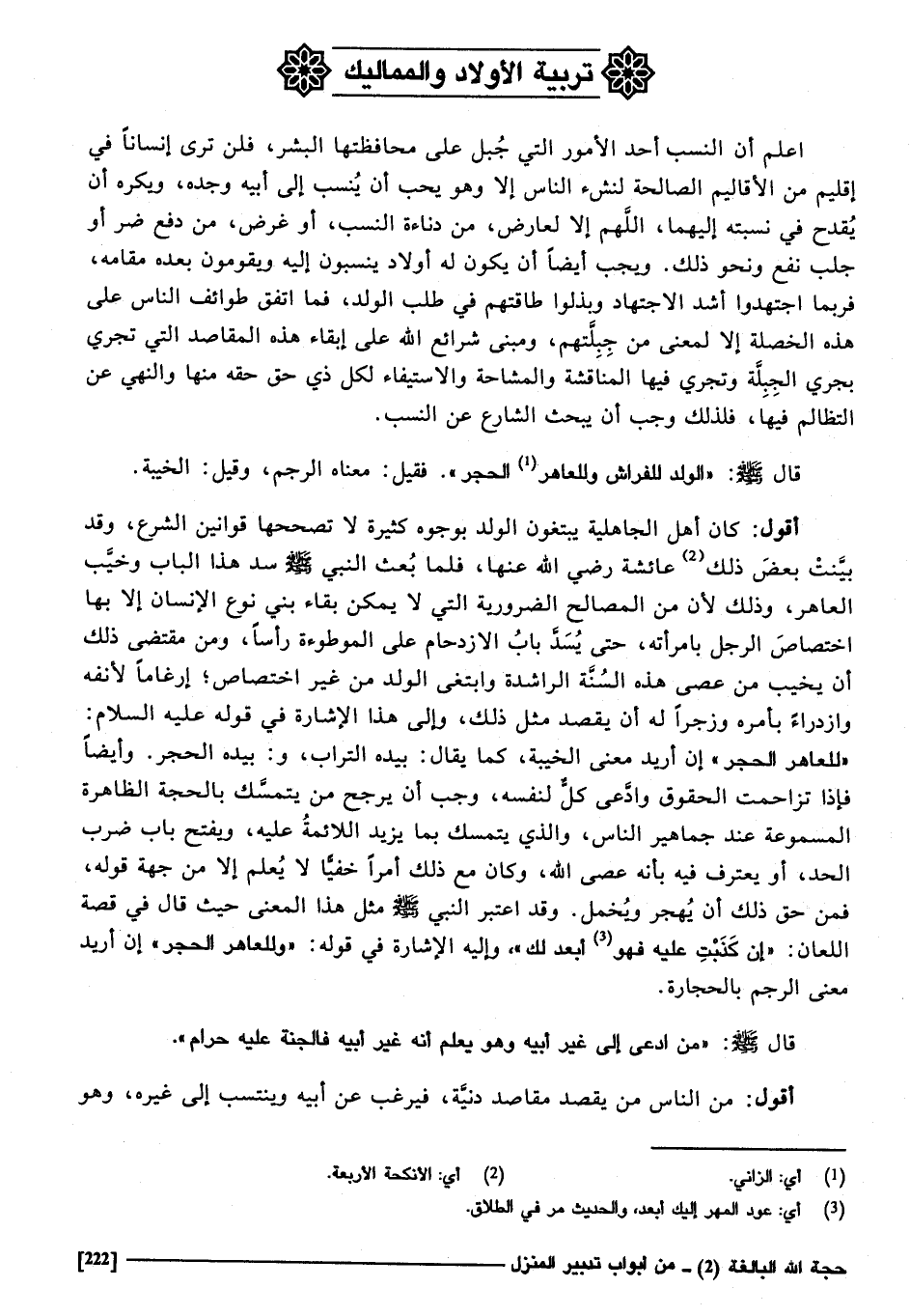 أَقُول: كَانَ أهل الْجَاهِلِيَّة يَبْتَغُونَ الْوَلَد بِوُجُوه كَثِيرَة لَا تصححها قوانين الشَّرْع، وَقد بيّنت بعض ذَلِك عَائِشَة رَضِي الله عَنْهَا، فَلَمَّا بعث النَّبِي صَلَّى اللهُ عَلَيْهِ وَسَلَّمَ سد هَذَا الْبَاب، وَخيَّب العاهر، وَذَلِكَ لِأَن من الْمصَالح الضرورية الَّتِي لَا يُمكن بَقَاء نوع الْإِنْسَان إِلَّا بهَا اخْتِصَاص الرجل بامرأته حَتَّى يسد بَاب الازدحام على الموطوأة رَأْسا، وَمن مُقْتَضى ذَلِك أَن يخيب من عصى هَذِه السّنة الراشدة، وابتغى الْوَلَد من غير اخْتِصَاص؛ إرغامه لأنفه وازدراء بأَمْره وزجرا لَهُ أَن يقْصد مثل ذَلِك، وَإِلَى هَذَا الْإِشَارَة فِي قَوْله عَلَيْهِ السَّلَام للعاهر الْحجر: " العاهر للحجر " إِن أُرِيد معنى الخيبة كَمَا يُقَال: بِيَدِهِ التُّرَاب، وَبِيَدِهِ الْحجر، وَأَيْضًا فَإِذا تزاحمت الْحُقُوق، وَادّعى كل لنَفسِهِ وَجب أَن يرجح من يتَمَسَّك بِالْحجَّةِ الظَّاهِرَة المسموعة عِنْد جَمَاهِير النَّاس وَالَّذِي يتَمَسَّك بِمَا يزِيد اللأئمة عَلَيْهِ، وَيفتح بَاب ضرب الْحَد، أَو يعْتَرف فِيهِ بِأَنَّهُ عصى الله، وَكَانَ مَعَ ذَلِك أَمر خفِيا لَا يعلم إِلَّا فَمن جِهَة قَوْله: من حق ذَلِك أَن يهجر ويخمل، وَقد اعْتبر النَّبِي صَلَّى اللهُ عَلَيْهِ وَسَلَّمَ مثل هَذَا الْمَعْنى حَدِيث قَالَ فِي قصَّة اللّعان: