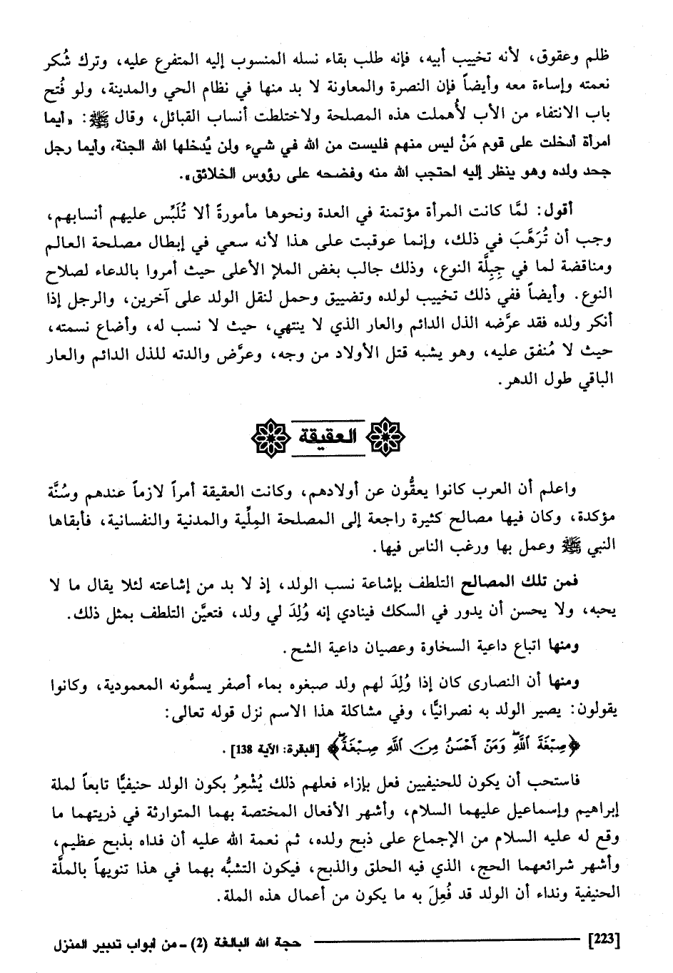 وَاعْلَم أَن الْعَرَب كَانُوا يعقون عَن أَوْلَادهم، وَكَانَت الْعَقِيقَة أمرا لَازِما عِنْدهم وَسنة مُؤَكدَة، وَكَانَ فِيهَا مصَالح كَثِيرَة رَاجِعَة إِلَى الْمصلحَة الملية وَالْمَدينَة فِيمَن تِلْكَ الْمصَالح التلطف بإشاعة نسب الْوَلَد، إِذْ لَا بُد من إشاعته لِئَلَّا يُقَال مَا لَا يُحِبهُ، وَلَا يحسن أَن يَدُور فِي السكَك، فينادي أَنه ولد لي ولد. فَتعين التلطف بِمثل ذَلِك، وَمِنْهَا اتِّبَاع دَاعِيَة السخاوة وعصيان دَاعِيَة الشُّح، وَمِنْهَا أَن النَّصَارَى كَانَ إِذا ولد لَهُم ولدا صبغوه بِمَاء اصفر يسمونه المعمودية، وَكَانُوا يَقُولُونَ: يصير الْوَلَد بِهِ نَصْرَانِيّا، وَفِي مشاكلة هَذَا الِاسْم نزل قَوْله تَعَالَى: