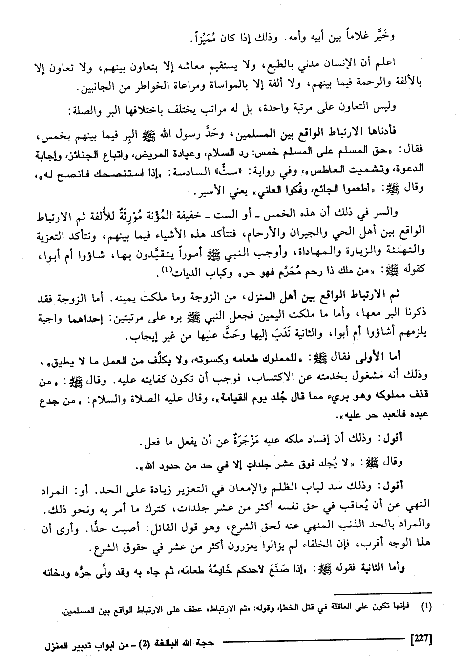 اعْلَم أَن الْإِنْسَان مدنِي بالطبع لَا يَسْتَقِيم معاشه إِلَّا بتعاون بَينهم، وَلَا تعاون إِلَّا بالألفة وَالرَّحْمَة فِيمَا بَينهم، وَلَا ألفة إِلَّا بالمواساة ومراعاة الخواطر من الْجَانِبَيْنِ، وَلَيْسَ التعاون على مرتبَة وَاحِدَة، بل لَهُ مَرَاتِب يخْتَلف باختلافها الْبر والصلة، فأدناها الارتباط الْوَاقِع بَين الْمُسلمين، وحد رَسُول الله صَلَّى اللهُ عَلَيْهِ وَسَلَّمَ الْبر فِيمَا بَينهم بِخمْس، فَقَالَ: " حق الْمُسلم على الْمُسلم خمس: رد السَّلَام، وعيادة الْمَرِيض، وَاتِّبَاع الْجَنَائِز، وَإجَابَة الدعْوَة وتشميت الْعَاطِس " وَفِي رِوَايَة سِتَّة السَّادِسَة " إِذا استنصحك فانصح لَهُ: وَقَالَ صَلَّى اللهُ عَلَيْهِ وَسَلَّمَ: " أطعموا الجائع، وفكوا العاني " يَعْنِي الْأَسير.