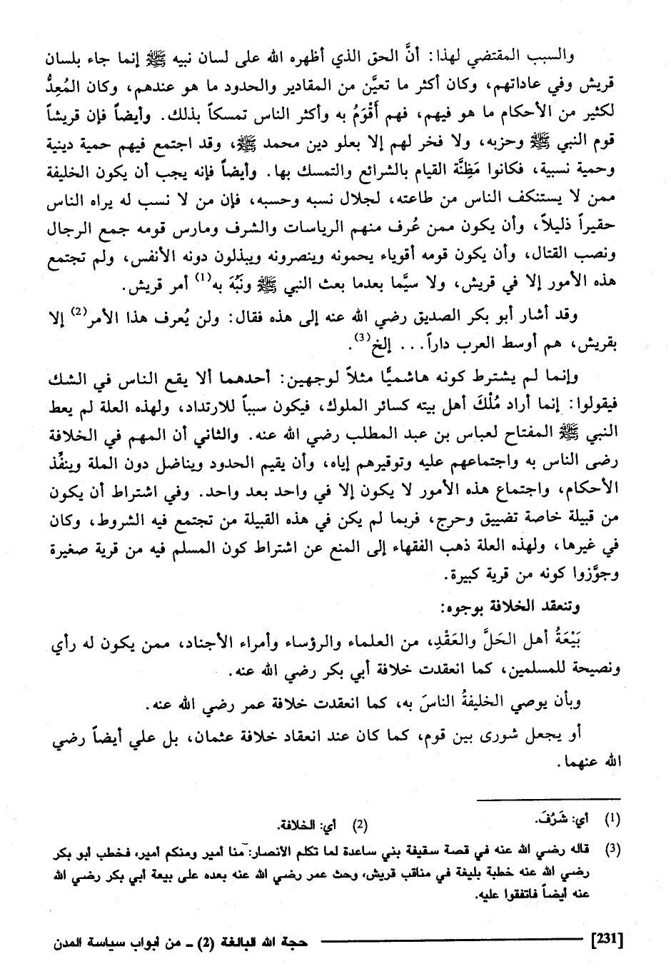 وَالثَّانِي أَن المهم فِي الْخلَافَة رضَا النَّاس بِهِ واجتماعهم عَلَيْهِ وتوقيرهم إِيَّاه وَأَن يُقيم الْحُدُود، ويناضل دون الْملَّة، وَينفذ الأحكم، واجتماع هَذِه الْأُمُور لَا يكون إِلَّا فِي وَاحِد بعد وَاحِد، وَفِي اشْتِرَاط أَن تكون من قَبيلَة خَاصَّة تضييق وحرج فَرُبمَا لم يكن فِي هَذِه الْقَبِيلَة من تَجْتَمِع فِيهِ الشُّرُوط، وَكَانَ فِي غَيرهَا، ولهذه الْعلَّة ذهب الْفُقَهَاء إِلَى الْمَنْع عَن اشْتِرَاط كَون الْمُسلم فِيهِ من قَرْيَة صَغِيرَة وجوزوا كَونه من قَرْيَة كَبِيرَة.