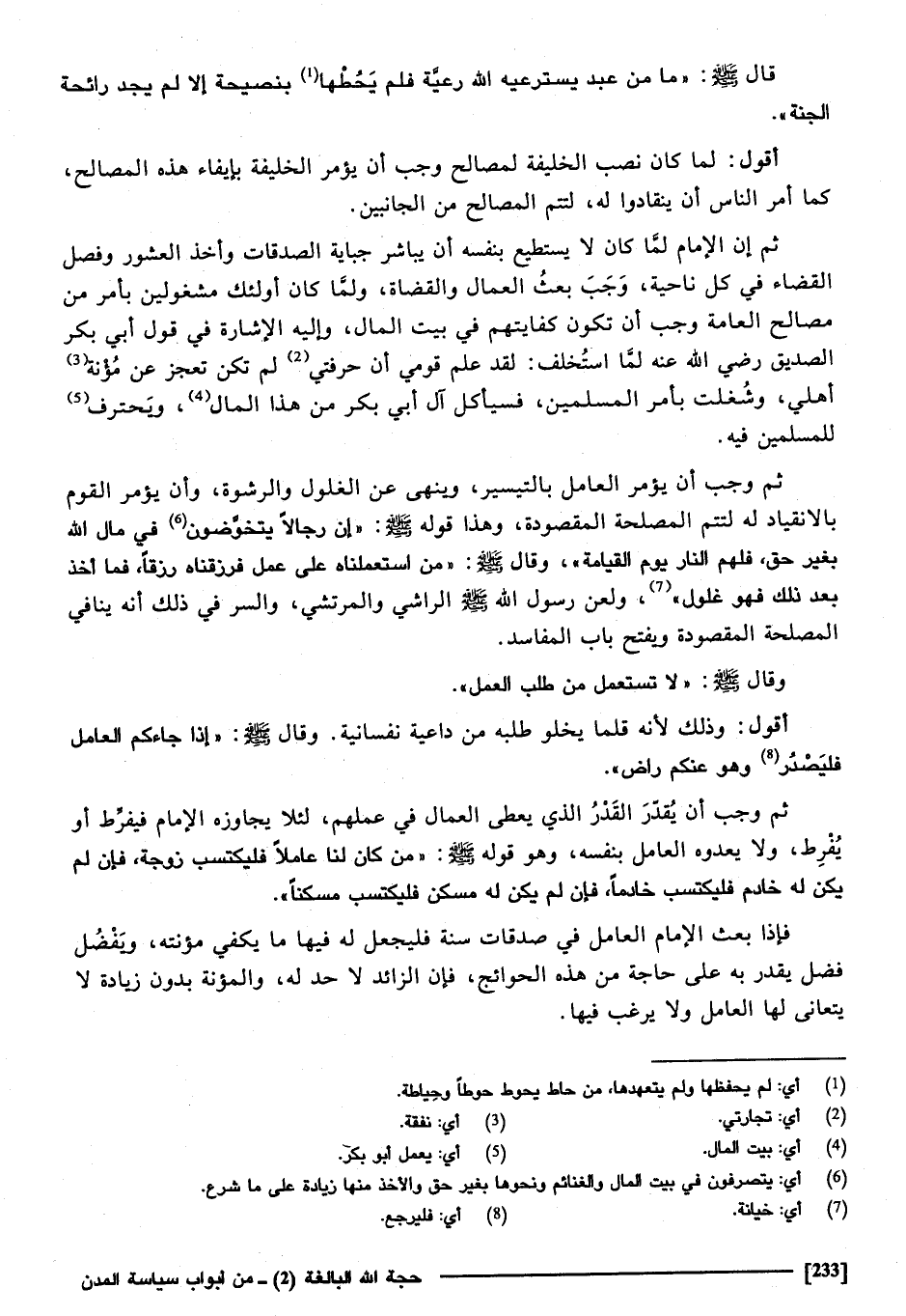" مَا من عبد يسترعيه الله رعية، فَلم يحطهَا بنصيحة إِلَّا لم يجد رَائِحَة الْجنَّة " أَقُول لما كَانَ نصب الْخَلِيفَة لمصَالح وَجب أَن يُؤمر الْخَلِيفَة بايفاء هَذِه الْمصَالح، كَمَا أَمر النَّاس أَن ينقادوا لَهُ، لتتم الْمصَالح من الْجَانِبَيْنِ.