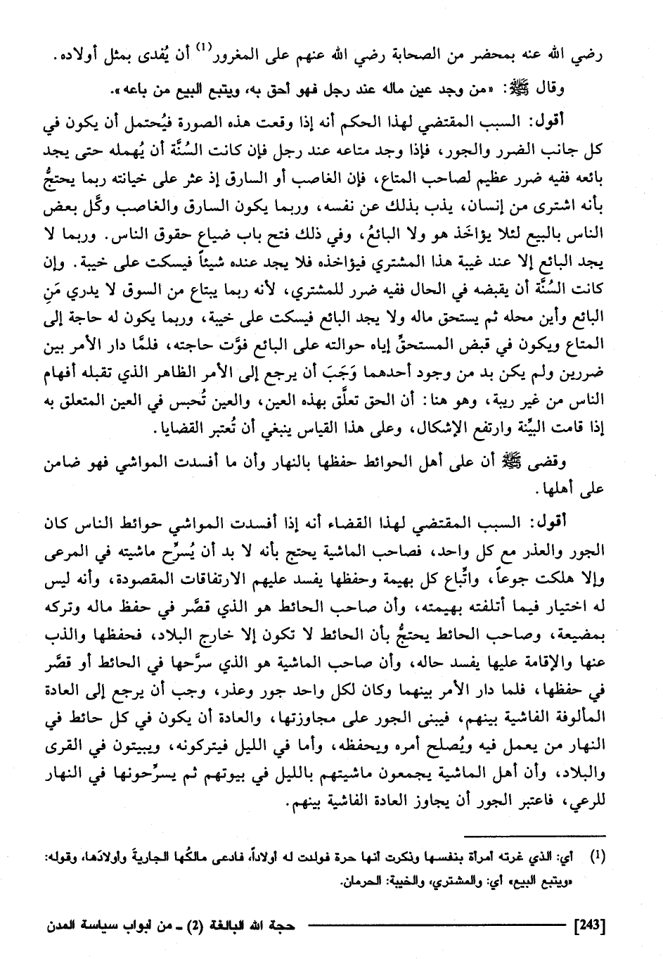 " من وجد عين مَاله عِنْد رجل فَهُوَ أَحَق بِهِ، وَيتبع البيع من بَاعه " أَقُول السَّبَب الْمُقْتَضِي لهَذَا الحكم أَنه إِذا وَقعت هَذِه الصُّورَة فَيحْتَمل أَن يكون فِي كل جَانب الضَّرَر والجور، فَإِذا وجد مَتَاعه عِنْد رجل. فان كَانَت السّنة أَن يهمله حَتَّى يجد بَائِعه فَفِيهِ ضَرَر عَظِيم لصَاحب الْمَتَاع، فان الْغَاصِب أَو السَّارِق إِذا عثر على خيانته رُبمَا يحْتَج بِأَنَّهُ اشْترِي من إِنْسَان يذب بذلك عَن نَفسه، وَرُبمَا يكون السَّارِق وَالْغَاصِب وكل بعض النَّاس بِالْبيعِ لِئَلَّا يُؤَاخذ هُوَ وَلَا البَائِع، وَفِي ذَلِك فتح بَاب ضيَاع حُقُوق النَّاس، وَرُبمَا لَا يجد البَائِع إِلَّا عِنْد غيبَة هَذَا المُشْتَرِي فيؤاخذه فَلَا يجد عِنْده شَيْء فيسكت على خيبة، وَإِن كَانَت السّنة أَن يقبضهُ فِي الْحَال فَفِيهِ ضَرَر للْمُشْتَرِي لِأَنَّهُ رُبمَا يبْتَاع من السُّوق لَا يدْرِي من البَائِع وَأَيْنَ مَحَله ثمَّ يسْتَحق مَاله وَلَا يجد البَائِع فيسكت على خيبة وَرُبمَا يكون لَهُ حَاجَة إِلَى الْمَتَاع وَيكون فِي قبض