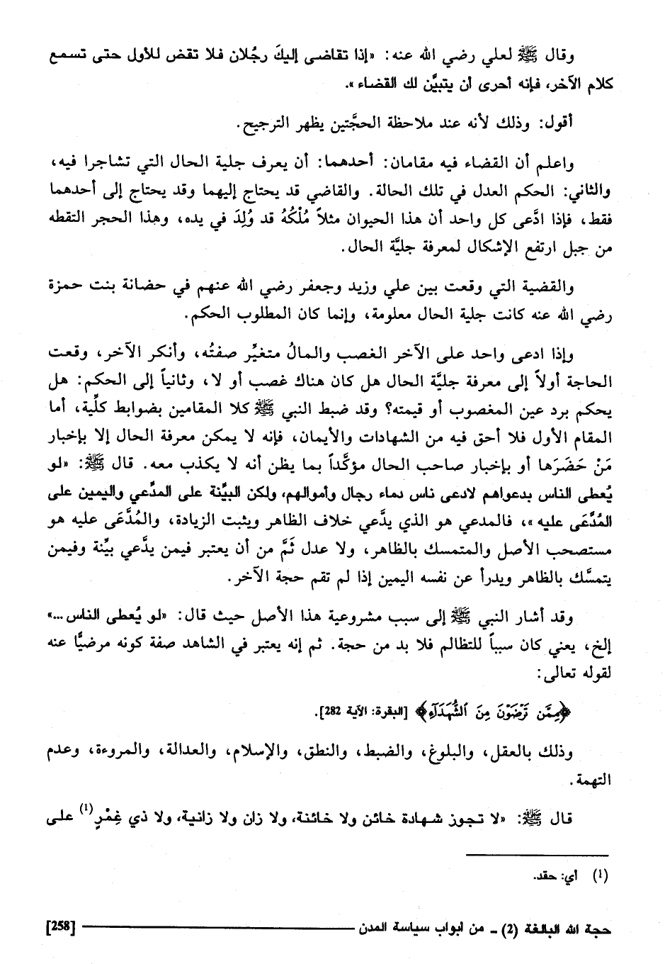 وَقَالَ صَلَّى اللهُ عَلَيْهِ وَسَلَّمَ لعَلي رَضِي الله عَنهُ: " إِذا تقاضى إِلَيْك رجلَانِ فَلَا تقض للْأولِ حَتَّى تسمع كَلَام الآخر فَإِنَّهُ أَحْرَى أَن يتَبَيَّن لَك الْقَضَاء أَقُول: وَذَلِكَ لِأَنَّهُ عِنْد مُلَاحظَة الحجتين يظْهر التَّرْجِيح ".