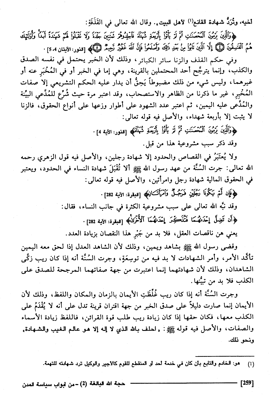 وَفِي حكم الْقَذْف. وَالزِّنَا سَائِر الْكَبَائِر، وَذَلِكَ لِأَن الْخَبَر يحْتَمل فِي نَفسه الصدْق وَالْكذب وَإِنَّمَا يتَرَجَّح أحد المحتملين بِالْقَرِينَةِ، وَهِي إِمَّا فِي الْمخبر أَو الْمخبر عَنهُ أَو غَيرهمَا، وَلَيْسَ شَيْء من ذَلِك مضبوطا يحِق أَن يدار عَلَيْهِ الحكم التشريعي إِلَّا صِفَات الْمخبر غير مَا ذكرنَا من الظَّاهِر والاستصحاب، وَقد اعْتبر مرّة حَيْثُ شرع للْمُدَّعِي الْبَيِّنَة وَالْمُدَّعى عَلَيْهِ الْيَمين ثمَّ اعْتبر عدد الشُّهُود على أطوار وزعها على أَنْوَاع الْحُقُوق، فالزنا لَا يثبت إِلَّا بأَرْبعَة شُهَدَاء. وَالْأَصْل فِيهِ قَوْله تَعَالَى:
