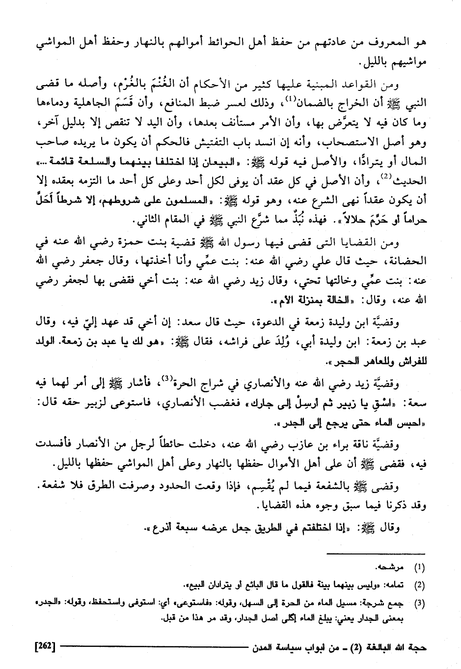 وَقَضِيَّة زيد رَضِي الله عَنهُ. والأنصاري فِي شراج الْحرَّة فَأَشَارَ صَلَّى اللهُ عَلَيْهِ وَسَلَّمَ إِلَى أَمر لَهما فِي سَعَة " اسْقِ يَا زبير ثمَّ أرسل إِلَى جَارك فَغَضب الْأنْصَارِيّ، فاستوعى لزبير حَقه قَالَ: احْبِسْ المَاء حَتَّى يرجع إِلَى الْجدر ".