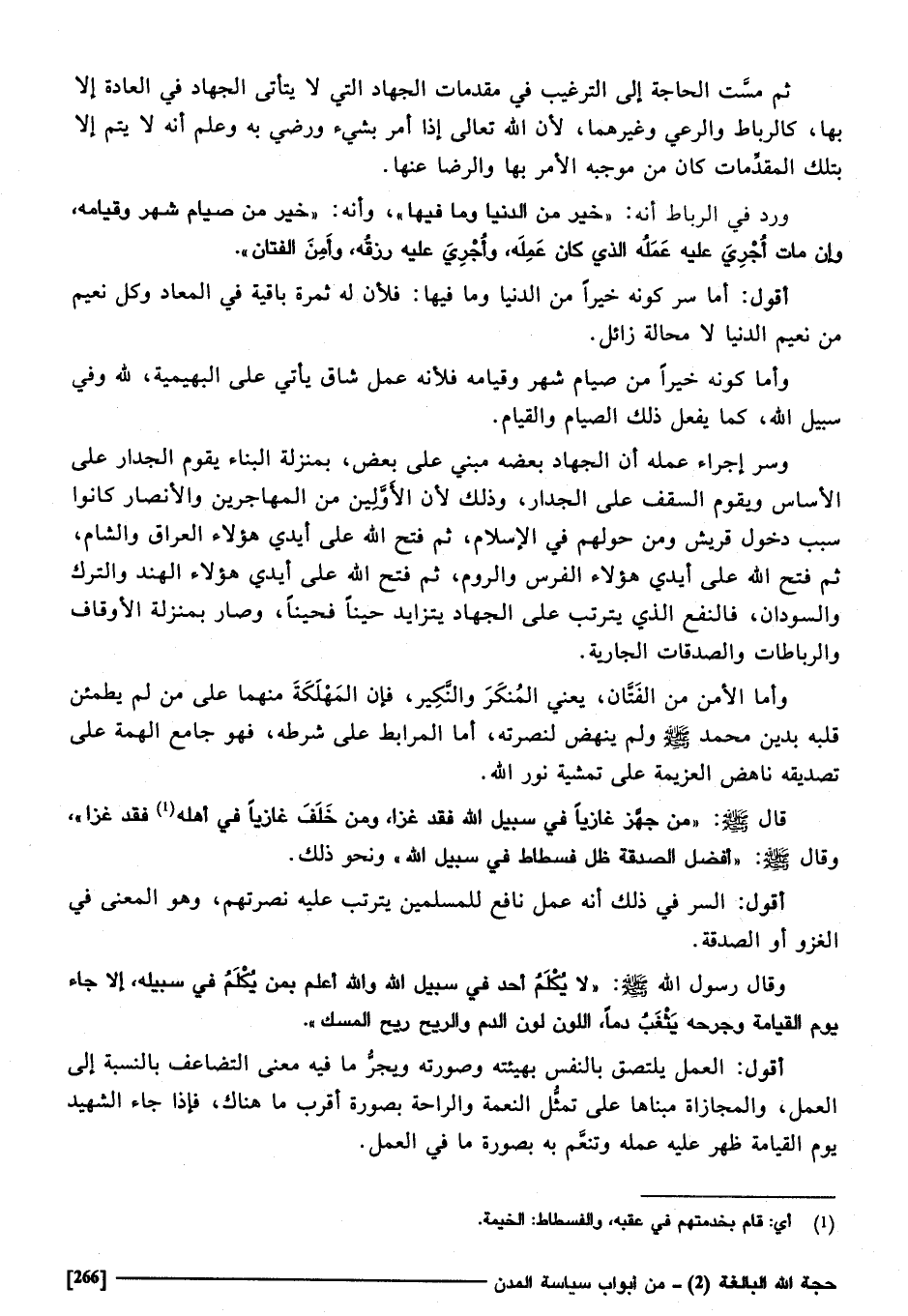 وسر إِجْرَاء عمله أَن الْجِهَاد بعضه مبْنى على بعض بِمَنْزِلَة الْبناء وَيقوم الْجِدَار على الأساس وياقوم السّقف على الْجِدَار، وَذَلِكَ لِأَن الْأَوَّلين من الْمُهَاجِرين وَالْأَنْصَار كَانُوا سَبَب دُخُول قُرَيْش وَمن حَولهمْ فِي الْإِسْلَام ثمَّ فتح الله على أَيدي هَؤُلَاءِ الْعرَاق وَالشَّام، ثمَّ فتح الله على أَيدي هَؤُلَاءِ الْفرس وَالروم، ثمَّ فتح الله على أَيدي هَؤُلَاءِ الْهِنْد وَالتّرْك والسودان، فالنفع الَّذِي يَتَرَتَّب على الْجِهَاد يتزايد حينا فحينا وَصَارَ بِمَنْزِلَة الْأَوْقَاف
