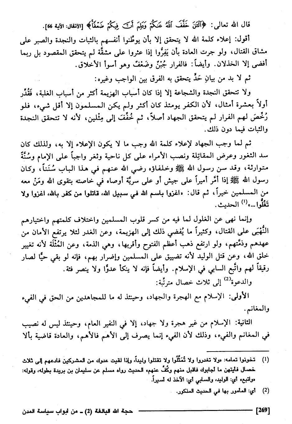 والدعوة إِلَى ثَلَاث خِصَال مترتبة: الأولى الْإِسْلَام مَعَ الْهِجْرَة وَالْجهَاد وَحِينَئِذٍ لَهُ مَا للمجاهدين من الْحق فِي الْفَيْء والمغانم.
