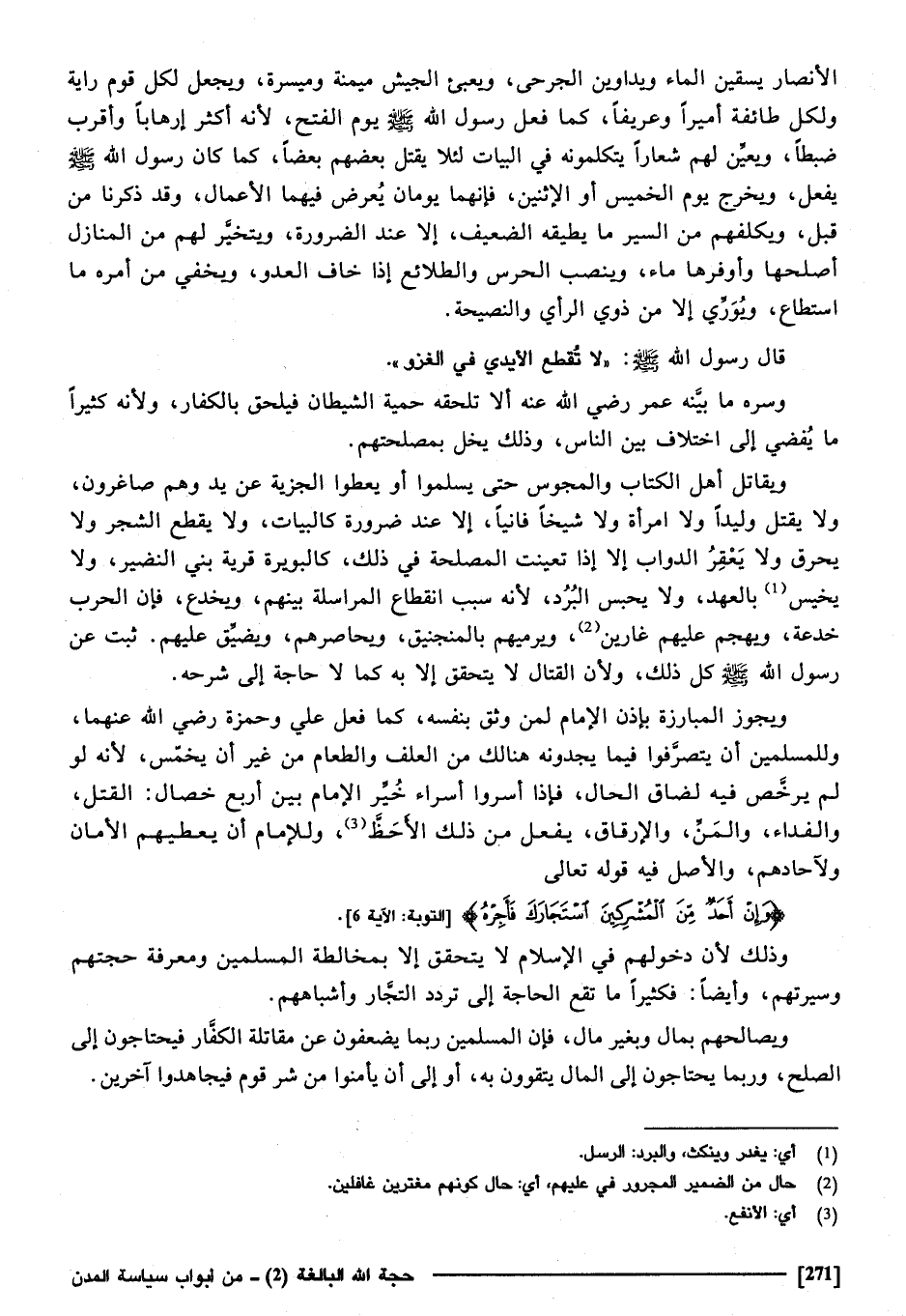 " لَا تقطع الْأَيْدِي فِي الْغَزْو " وسره مَا بَينه عمر رَضِي الله عَنهُ أَلا تلْحقهُ حمية الشَّيْطَان فَيلْحق بالكفار، وَلِأَنَّهُ كثيرا مَا يُفْضِي إِلَى اخْتِلَاف بَين النَّاس، وَذَلِكَ يخل بمصلحتهم، وَيُقَاتل أهل الْكتاب وَالْمَجُوس حَتَّى يسلمُوا أَو يُعْطوا الْجِزْيَة عَن يَد وهم صاغرون، وَلَا يقتل وليدا. وَلَا امْرَأَة، وَلَا شَيخا فانيا إِلَّا عِنْد ضَرُورَة كالبيات، وَلَا يقطع الشّجر، وَلَا يحرق، وَلَا يعقر الدَّوَابّ إِلَّا إِذا تعيّنت الْمصلحَة فِي ذَلِك كالبويرة قَرْيَة بني النَّضِير، وَلَا يخيس بالعهد، وَلَا يحبس الْبرد لِأَنَّهُ سَبَب انْقِطَاع المراسلة بَينهم، ويخدع فَإِن الْحَرْب خدعة، ويهجم عَلَيْهِم غارين ويرميهم بالمنجنيق، ويحاصرهم، ويضيق عَلَيْهِم ثَبت عَن رَسُول الله صَلَّى اللهُ عَلَيْهِ وَسَلَّمَ كل ذَلِك، وَلِأَن الْقِتَال لَا يتَحَقَّق إِلَّا بِهِ كَمَا لَا حَاجَة إِلَى شَرحه، وَيجوز المبارزة بِإِذن الإِمَام لمن وثق بِنَفسِهِ كَمَا فعل عَليّ. وَحَمْزَة رَضِي الله عَنْهُمَا. وللمسلمين أَن يتصرفوا فِيمَا يجدونه هُنَالك من الْعلف وَالطَّعَام من غير أَن يُخَمّس لِأَنَّهُ لَو لم يرخص فِيهِ لضاق الْحَال فَإِذا أَسرُّوا أسراء خير الإِمَام بَين أَربع خِصَال، الْقَتْل، وَالْفِدَاء، والمن، والارقاق يفعل من ذَلِك الأحظ وَللْإِمَام أَن يعطيهم الْأمان ولآحادهم.