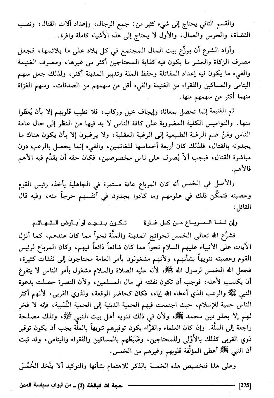 فشرع الله تَعَالَى الْخمس لحوائج الْمَدِينَة وَالْملَّة نَحوا مِمَّا كَانَ عِنْدهم كَمَا أنزل الْآيَات على الْأَنْبِيَاء عَلَيْهِم السَّلَام نَحوا مِمَّا كَانَ شَائِعا ذائعا فيهم، وَكَانَ المرباع لرئيس الْقَوْم وعصبته تنويها بشأنهم وَلِأَنَّهُم مشغولون بِأَمْر الْعَامَّة محتاجون إِلَى نفقات كَثِيرَة، فَجعل الله الْخمس لرَسُول الله صَلَّى اللهُ عَلَيْهِ وَسَلَّمَ لِأَنَّهُ عَلَيْهِ السَّلَام مَشْغُول بِأَمْر النَّاس لَا يتفرغ أَن يكْتَسب لأَهله، فَوَجَبَ أَن تكون نَفَقَته فِي مَال الْمُسلمين، وَلِأَن النُّصْرَة حصلت بدعوة النَّبِي صَلَّى اللهُ عَلَيْهِ وَسَلَّمَ والرعب الَّذِي أعطَاهُ الله إِيَّاه، فَكَانَ كحاضر الْوَقْعَة، ولذوي الْقُرْبَى لأَنهم أَكثر النَّاس حمية لِلْإِسْلَامِ حَيْثُ اجْتمع فيهم الحمية الدِّينِيَّة إِلَى الحمية النسبية فَإِنَّهُ لَا فَخر لَهُم إِلَّا بعلو دين مُحَمَّد صَلَّى اللهُ عَلَيْهِ وَسَلَّمَ، وَلِأَن فِي ذَلِك تنويه أهل بَيت النَّبِي صَلَّى اللهُ عَلَيْهِ وَسَلَّمَ وَتلك مصلحَة رَاجِعَة إِلَى الْملَّة، وَإِذا كَانَ الْعلمَاء والقراء يكون توقيرهم تنويها بالملة يجب أَن يكون توقير ذَوي الْقُرْبَى كَذَلِك بِالْأولَى، وللمحتاجين وضبطهم بالمساكين والفقراء واليتامى، وَقد ثَبت أَن النَّبِي صَلَّى اللهُ عَلَيْهِ وَسَلَّمَ أعْطى الْمُؤَلّفَة قُلُوبهم وَغَيرهم من الْخمس.
