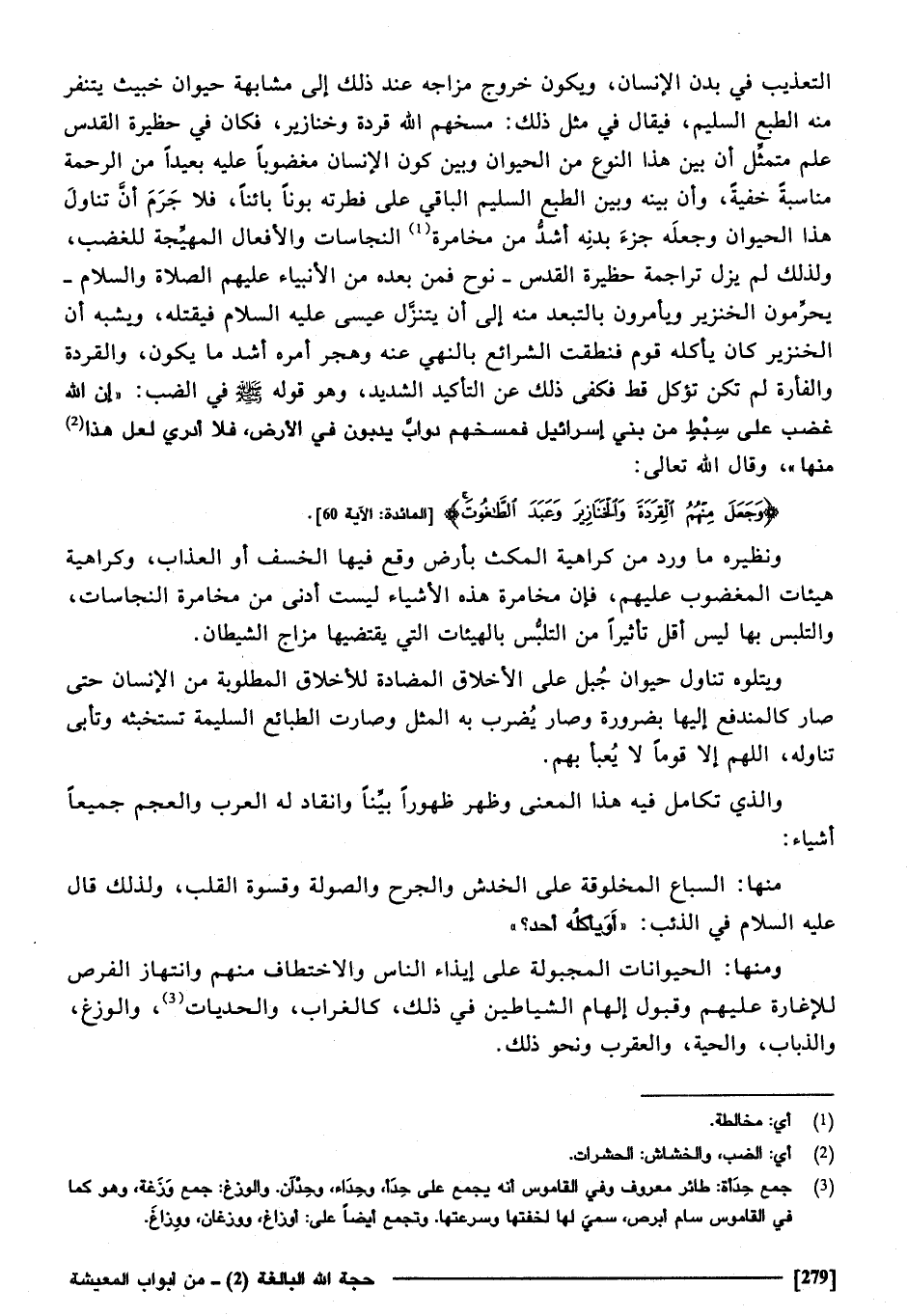 التعذيب فِي بدن الْإِنْسَان وَيكون خُرُوج مزاجه عِنْد ذَلِك إِلَى مشابهة حَيَوَان خَبِيث يتنفر مِنْهُ الطَّبْع السَّلِيم فَيُقَال فِي مثل ذَلِك مسخ الله قردة وَخَنَازِير فَكَانَ فِي حَظِيرَة الْقُدس علم متمثل أَن بَين هَذَا النَّوْع من الْحَيَوَان وَبَين كَون الْإِنْسَان مغضوبا عَلَيْهِ بَعيدا من الرَّحْمَة مُنَاسبَة خُفْيَة وَأَن بَينه وَبَين الطَّبْع السَّلِيم الْبَاقِي على فطرته بونا بَائِنا فَلَا جرم أَن تنَاول هَذَا الْحَيَوَان وَجعله جُزْء بدنه أَشد من مخامرة النَّجَاسَات وَالْأَفْعَال المهيجة للغضب وَلذَلِك لم يزل تراجمة حَظِيرَة الْقُدس نوح فَمن بعده من الْأَنْبِيَاء عَلَيْهِم الصَّلَاة وَالسَّلَام يحرمُونَ الْخِنْزِير ويأمرون بالتبعد مِنْهُ إِلَى أَن يتنزل عِيسَى عَلَيْهِ السَّلَام فيقتله، وَيُشبه أَن الْخِنْزِير كَانَ يَأْكُلهُ قوم فنطقت الشَّرَائِع بِالنَّهْي عَنهُ وهجر أمره أَشد مَا يكون، والقردة. والفأرة لم تكن تُؤْكَل قطّ فَكفى ذَلِك عَن التَّأْكِيد الشَّديد، وَهُوَ قَوْله صَلَّى اللهُ عَلَيْهِ وَسَلَّمَ فِي الضَّب. " إِن الله غضب على سبط من
