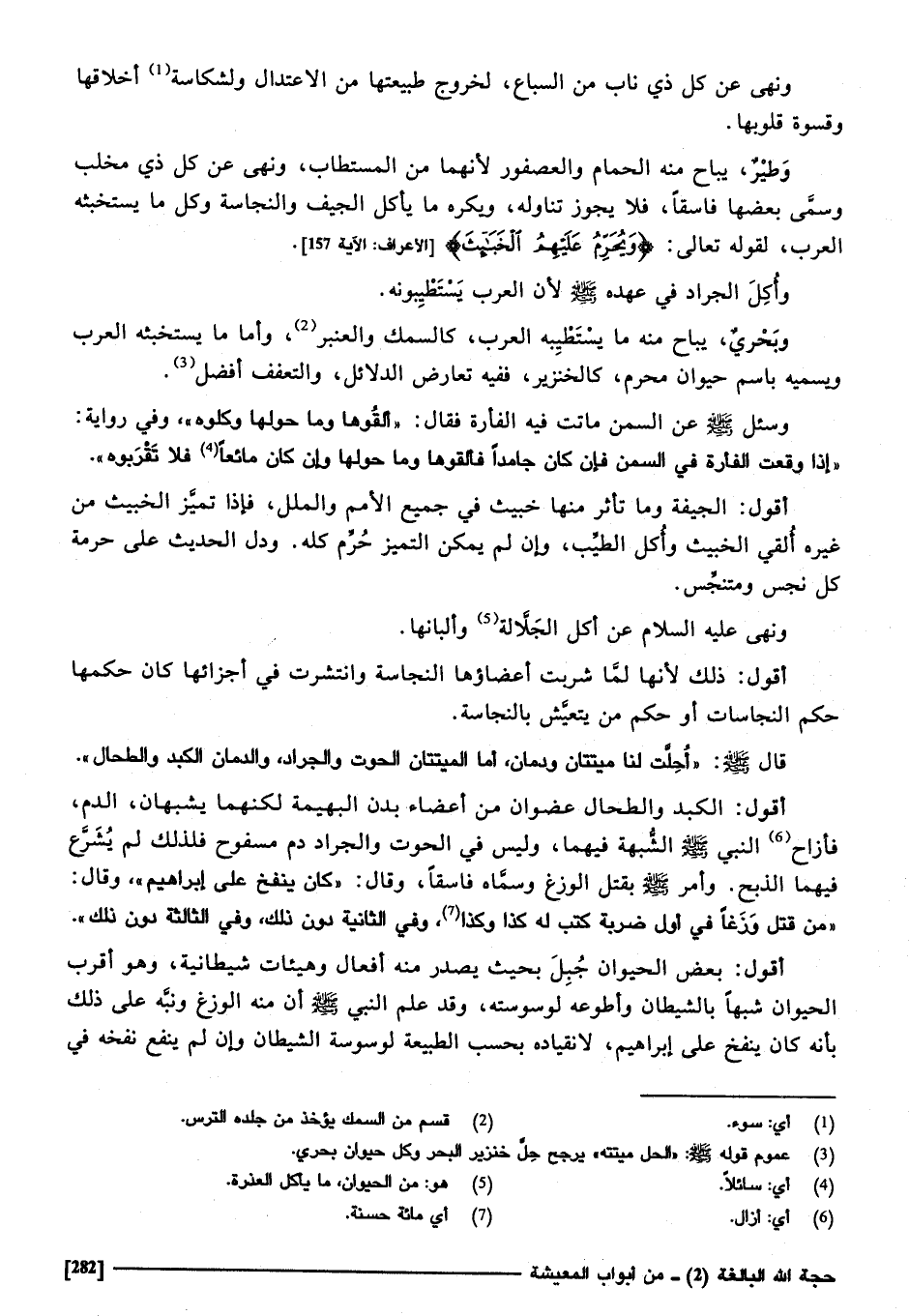 " أحلّت لنا ميتَتَانِ وَدَمَانِ أما الْمَيتَتَانِ الْحُوت وَالْجَرَاد والدمان الكبد وَالطحَال "، أَقُول: الكبد وَالطحَال عضوان من أَعْضَاء بدن الْبَهِيمَة لكنهما يشبهان الدَّم فأزاح النَّبِي صَلَّى اللهُ عَلَيْهِ وَسَلَّمَ الشّبَه فيهمَا وَلَيْسَ فِي الْحُوت وَالْجَرَاد دم مسفوح فَلذَلِك لم يشرع فيهمَا الذّبْح، وَأمر صَلَّى اللهُ عَلَيْهِ وَسَلَّمَ بقتل الوزغ وَسَماهُ فَاسِقًا وَقَالَ: " كَانَ ينْفخ على إِبْرَاهِيم " وَقَالَ: " من قتل وزغا فِي أول ضَرْبَة كتب لَهُ كَذَا وَكَذَا وَفِي الثَّانِيَة دون ذَلِك وَفِي الثَّالِثَة دون ذَلِك ".