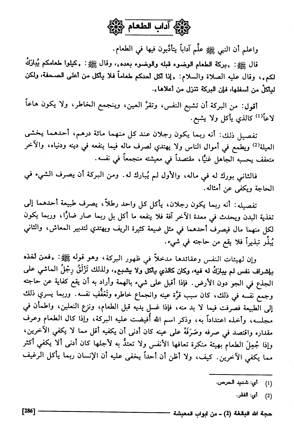: " فَمن اخذه بإشراف نفس لم يُبَارك لَهُ فِيهِ وَكَانَ كَالَّذي لَا يَأْكُل وَلَا يشْبع " وَلذَلِك تزلق رجل الْمَاشِي على الْجذع فِي الجو دون الأَرْض فَإِذا أقبل على شَيْء بالهمة وَأَرَادَ بِهِ أَن يَقع كِفَايَة عَن حَاجته وَجمع نَفسه فِي ذَلِك كَانَ سَبَب قوه عينه وانجماع خاطره وتعفف نَفسه، وَرُبمَا يسري ذَلِك إِلَى الطبيعة فصرفت فِيمَا لَا بُد مِنْهُ، فَإِذا عسل يَدَيْهِ قبل الطَّعَام وَنزع النَّعْلَيْنِ وَاطْمَأَنَّ فِي مَجْلِسه وَأَخذه اعتدادا بِهِ وَذكر اسْم الله أفيضت عَلَيْهِ الْبركَة، وَإِذا كال الطَّعَام وَعرف مِقْدَاره واقتصد فِي صرفه وَصَرفه على عينه كَانَ أدنى أَن يَكْفِيهِ اقل مِمَّا لَا يَكْفِي الآخرين، وَإِذا جعل الطَّعَام بهيئة مُنكرَة تعافها الْأَنْفس وَلَا تَعْتَد بِهِ لأَجلهَا كَانَ أدنى أَلا يكفى أَكثر مِمَّا يَكْفِي الآخرين كَيفَ وَلَا أَظن أَن أحدا يخفى عَلَيْهِ أَن الْإِنْسَان رُبمَا يَأْكُل الرَّغِيف