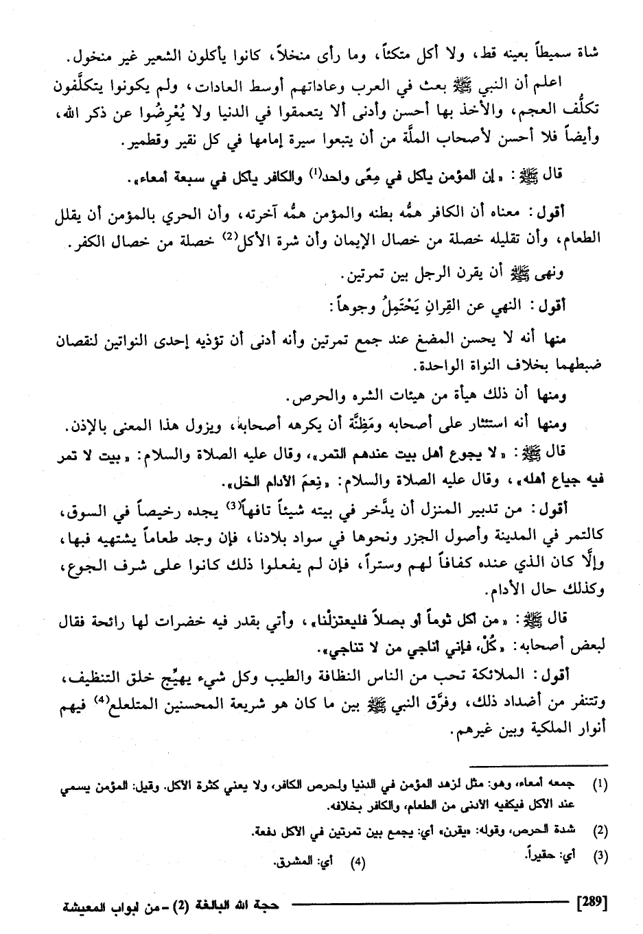 قَالَ صَلَّى اللهُ عَلَيْهِ وَسَلَّمَ: إِن الْمُؤمن يَأْكُل فِي معى وَاحِد وَالْكَافِر يَأْكُل فِي سَبْعَة أمعاء ".