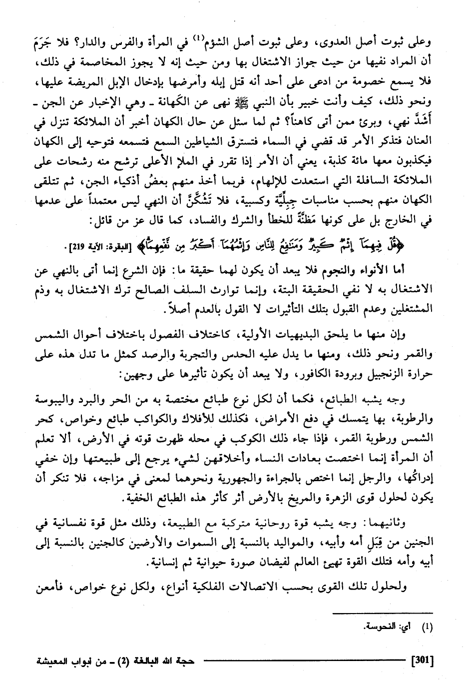 أَتَى بِالنَّهْي عَن الِاشْتِغَال بِهِ لانفى الْحَقِيقَة أَلْبَتَّة وَإِنَّمَا توارث السّلف الصَّالح ترك الأشتغال بِهِ وذم المشتغلين وَعدم الْقبُول بِتِلْكَ التأثيرات لَا القَوْل بِالْعدمِ أصلا، وَإِن مِنْهَا مَا يلْحق البديهيات الأولية كاختلاف الْفُصُول باخْتلَاف أَحْوَال الشَّمْس وَالْقَمَر وَنَحْو ذَلِك.