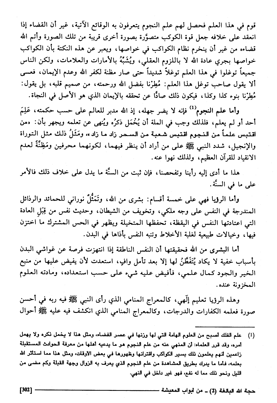 وَأما علم النُّجُوم فَإِنَّهُ لَا يضر جَهله إِذْ الله مُدبر للْعَالم على حسب حكمته على علم أحد أَو لم يعلم فَلذَلِك وَجب فِي الْملَّة أَن يخمل ذكره وَينْهى عَن تعلمه ويجهر بِأَن " من اقتبس علما من النُّجُوم اقتبس شُعْبَة من السحر زَاد مَا زَاد " وَمثل ذَلِك مثل التَّوْرَاة وَالْإِنْجِيل شدد النَّبِي صَلَّى اللهُ عَلَيْهِ وَسَلَّمَ على من من أَرَادَ أَن ينظر فيهمَا لِكَوْنِهِمَا محرفين ومظنة لعدم الانقياد لِلْقُرْآنِ الْعَظِيم وَلذَلِك نهوا عَنهُ.