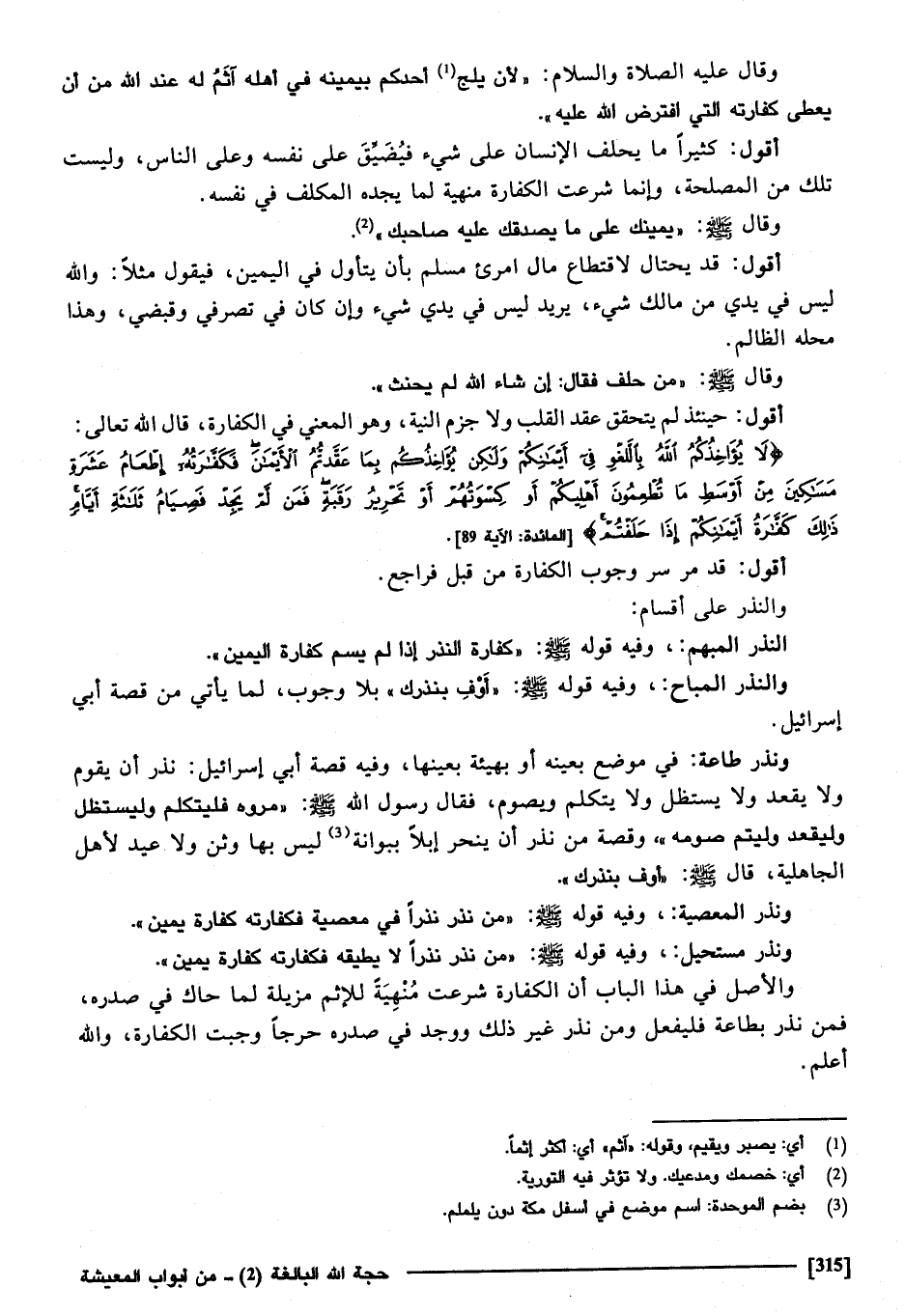 وَقَالَ عَلَيْهِ الصَّلَاة وَالسَّلَام لِأَن بلج: " إِن يلاج أحدكُم بِيَمِينِهِ فِي أَهله آثم لَهُ عِنْد الله من أَن يُعْطي كَفَّارَته الَّتِي افْترض الله عَلَيْهِ " أَقُول: كثيرا مَا يحلف الْإِنْسَان على شَيْء فيضيق على نَفسه وعَلى النَّاس وَلَيْسَت تِلْكَ من الْمصلحَة، وَإِنَّمَا شرعت الْكَفَّارَة منهية لما يجده الْمُكَلف على نَفسه.