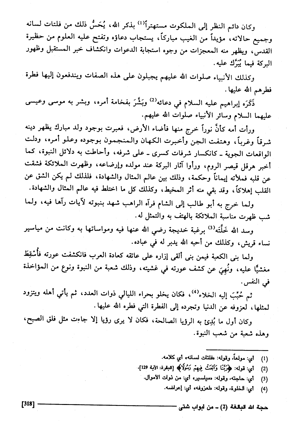 وَلما خرج بِهِ أَبُو طَالب إِلَى الشَّام فَرَآهُ الراهب شهد بنبوته لآيَات رَآهَا فِيهِ، وَلما شب ظَهرت مُنَاسبَة الْمَلَائِكَة بالهتف بِهِ والتمثل لَهُ.