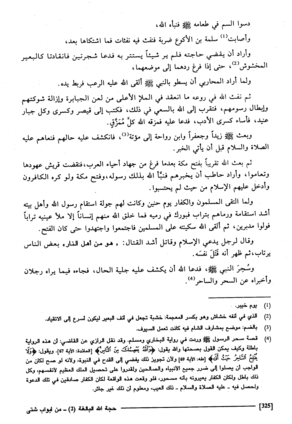 وَظَهَرت آيَات دسوا السم فِي طَعَامه صَلَّى اللهُ عَلَيْهِ وَسَلَّمَ فنبأه الله، وأصابت سَلمَة ابْن الْأَكْوَع ضَرْبَة فنفث فِيهَا نفثات فَمَا اشتكاها بعد، وَأَرَادَ أَن يقْضِي حَاجته فَلم لَا يجد شَيْئا يستر بِهِ فَدَعَا شجرتين فانقاديا كالبعير المخشوش حَتَّى إِذا فرغ ردهما إِلَى موضعهما، وَلما أَرَادَ المحاربى أَن يَسْطُو بِالنَّبِيِّ صَلَّى اللهُ عَلَيْهِ وَسَلَّمَ ألْقى الله عَلَيْهِ الرعب فَربط يَده.