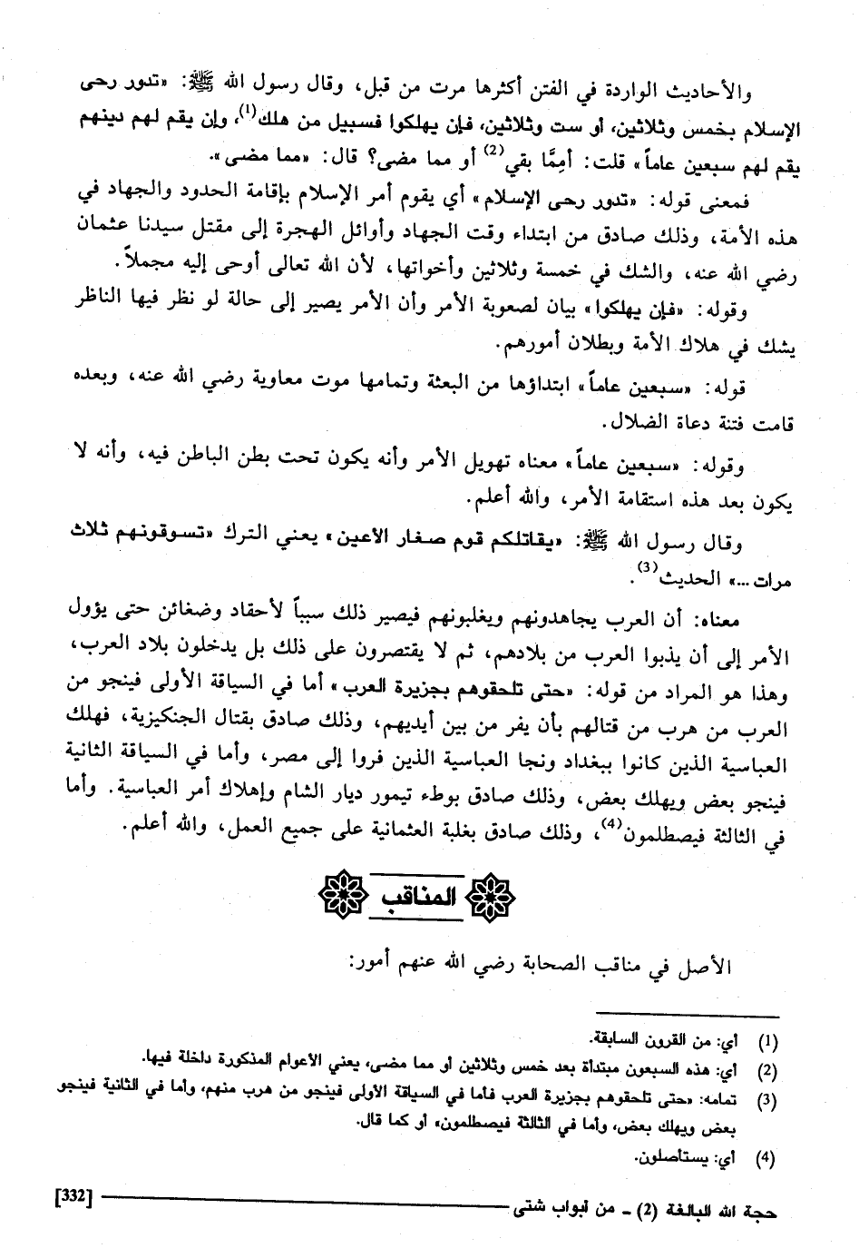 وَقَالَ رَسُول الله صَلَّى اللهُ عَلَيْهِ وَسَلَّمَ: " يُقَاتِلكُمْ قوم صغَار الْأَعْين - يَعْنِي التّرْك - تسوقونهم ثَلَاث مَرَّات " الحَدِيث مَعْنَاهُ أَن الْعَرَب يجاهدونهم ويغلبونهم فَيصير ذَلِك سَببا لأحقاد وضغائن حَتَّى يؤول الْأَمر إِلَى أَن يذبوا الْعَرَب من بِلَادهمْ ثمَّ لَا يقتصرون على ذَلِك بل يدْخلُونَ بِلَاد الْعَرَب، وَهَذَا هُوَ المُرَاد من قَوْله: " حَتَّى تلحقوهم بِجَزِيرَة الْعَرَب " أما فِي السِّيَاقَة الأولى فينجو من الْعَرَب من هرب من قِتَالهمْ بِأَن يفر من بَين أَيْديهم، وَذَلِكَ صَادِق بِقِتَال الجنكيزية فَهَلَك العباسية الَّذين كَانُوا بِبَغْدَاد وَنَجَا العباسية الَّذين فروا إِلَى مصر، وَأما فِي السِّيَاقَة الثَّانِيَة فينجو بعض وَيهْلك بعض، وَذَلِكَ صَادِق بِوَطْء تيمور ديار الشَّام وإهلاك أَمر العباسية " وَأما فِي الثَّالِثَة فيصطلمون " وَذَلِكَ صَادِق بِغَلَبَة العثمانية على جَمِيع الْعَمَل، وَالله أعلم.