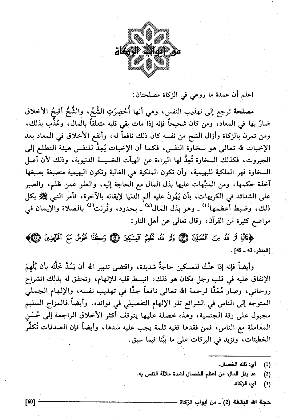 اعْلَم أَن عُمْدَة مَا روعي فِي الزَّكَاة مصلحتان: مصلحَة ترجع إِلَى تَهْذِيب النَّفس، وَهِي أَنَّهَا أحضرت الشُّح، وَالشح أقبح الْأَخْلَاق ضار بهَا فِي الْمعَاد، وَمن كَانَ شحيحا فَإِنَّهُ إِذا مَاتَ بقى قلبه مُتَعَلقا بِالْمَالِ، وعذب بذلك، وَمن تمرن بِالزَّكَاةِ، وأزال الشُّح من نَفسه كَانَ ذَلِك نَافِعًا لَهُ، أَنْفَع الْأَخْلَاق فِي الْمعَاد بعد الإخبات لله تَعَالَى هُوَ سخاوة النَّفس، فَكَمَا أَن الإخبات يعد للنَّفس هَيْئَة التطلع إِلَى الجبروت، فَكَذَلِك السخاوة تعد لَهَا الْبَرَاءَة عَن الهيآت الخسيسة الدُّنْيَوِيَّة، وَذَلِكَ لِأَن أصل السخاوة قهر الملكية البهيمية، وَأَن تكون الملكية هِيَ الْغَالِبَة وَتَكون البهيمية منصبغة بصبغها آخذة حكمهَا، وَمن المنبهات عَلَيْهَا بذل المَال مَعَ الْحَاجة إِلَيْهِ وَالْعَفو عَمَّن ظلم وَالصَّبْر على الشدائد فِي الكريهات بِأَن يهون عَلَيْهِ ألم الدُّنْيَا لَا يقانه بِالآخِرَة، فَأمر النَّبِي صَلَّى اللهُ عَلَيْهِ وَسَلَّمَ بِكُل ذَلِك، وَضبط أعظمها وَهُوَ بذل المَال بحدود، وقرنت بِالصَّلَاةِ وَالْإِيمَان فِي مَوَاضِع كَثِيرَة من الْقُرْآن وَقَالَ تَعَالَى عَن أهل النَّار: