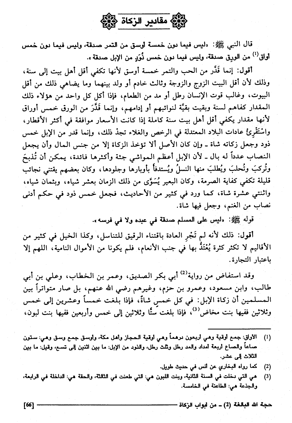 أَقُول: إِنَّمَا قدر من الْحبّ وَالتَّمْر خَمْسَة أوسق لِأَنَّهَا تَكْفِي أقل أهل بَيت إِلَى سنة، وَذَلِكَ لِأَن أقل الْبَيْت الزَّوْج وَالزَّوْجَة وثالث خَادِم أَو ولد بَينهمَا، وَمَا يضاهي ذَلِك من أقل الْبيُوت، وغالب قوت الْإِنْسَان رَطْل أَو مد من الطَّعَام، فَإِذا أكل كل وَاحِد من هَؤُلَاءِ ذَلِك الْمِقْدَار كفاهم لسنة، وَبقيت بَقِيَّة لنوائبهم أَو إدَامهمْ، وَإِنَّمَا قدر من الْوَرق خمس أوراق لِأَنَّهَا مِقْدَار يَكْفِي أقل أهل بَيت سنة كَامِلَة إِذا كَانَت الأسعار مُوَافقَة فِي أَكثر الأقطار، واستقرئ عادات الْبِلَاد المعتدلة فِي الرُّخص والغلاء وتجد ذَلِك، وَإِنَّمَا قدر من الْإِبِل خَمْسَة ذود وَجعل زَكَاته شَاة، وَإِن كَانَ الأَصْل أَلا تُؤْخَذ الزَّكَاة إِلَّا من جنس المَال وَأَن يَجْعَل النّصاب عددا لَهُ بَال لِأَن الأبل أعظم الْمَوَاشِي جثة وأكثرها فَائِدَة يُمكن أَن تذبح، وتركب، وتحلب، وَيطْلب مِنْهَا النَّسْل، ويستدفأ بأوبارها وجلودها، وَكَانَ بَعضهم يقتني نَجَائِب قَليلَة تَكْفِي كِفَايَة الصرمة، وَكَانَ الْبَعِير يُسَوِّي فِي ذَلِك الزَّمَان بِعشر شِيَاه وبثمان شِيَاه. واثتني عشر شَاة، كَمَا ورد فِي كثير من الْأَحَادِيث فَجعل خمس ذود فِي حكم أدنى نِصَاب من من الْغنم، وَجعل فِيهَا شَاة.