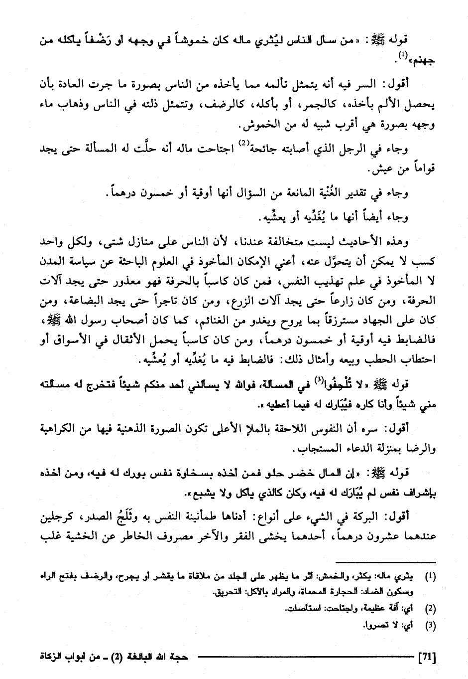 وَهَذِه الْأَحَادِيث لَيست متخالفة عندنَا، لِأَن النَّاس على منَازِل شَتَّى، وَلكُل وَاحِد كسب لَا يُمكن أَن يتَحَوَّل عَنهُ، أَعنِي الْإِمْكَان الْمَأْخُوذ فِي الْعُلُوم الباحثة عَن سياسة المدن لَا الْمَأْخُوذ فِي علم تَهْذِيب النَّفس، فَمن كَانَ كاسبا بالحرفة فَهُوَ مَعْذُور حَتَّى يجد آلَات الحرفة، وَمن كَانَ زارعا حَتَّى يجد آلَات الزَّرْع، وَمن كَانَ تَاجِرًا حَتَّى يجد البضاعة، وَمن كَانَ على الْجِهَاد مسترزقا بِمَا يروح وَيَغْدُو من الْغَنَائِم. كَمَا كَانَ أَصْحَاب رَسُول الله صَلَّى اللهُ عَلَيْهِ وَسَلَّمَ، فالضابط فِيهِ أُوقِيَّة أَو خَمْسُونَ درهما، وَمن كَانَ كاسبا يحمل الأثقال فِي الْأَسْوَاق، أَو احتطاب الْحَطب وَبيعه وأمثال ذَلِك فالضابط فَهِيَ مَا يغديه أَو يعشيه.