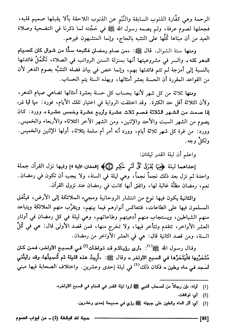 وفيهَا نزل الْقُرْآن جملَة وَاحِدَة ثمَّ نزل بعد ذَلِك نجما نجما، وَهِي لَيْلَة فِي السّنة، وَلَا يجب أَن تكون فِي رَمَضَان، نعم رَمَضَان مَظَنَّة غالبة لَهَا، وَاتفقَ أَنَّهَا كَانَت فِي رَمَضَان عِنْد نزُول الْقُرْآن، وَالثَّانيَِة يكون فِيهَا نوع من انتشار الروحانية ومجيء الْمَلَائِكَة إِلَى الأَرْض، فيتفق الْمُسلمُونَ فِيهَا على الطَّاعَات، فتتعاكس أنوارهم فِيمَا بَينهم، ويتقرب مِنْهُم الْمَلَائِكَة، ويتباعد مِنْهُم الشَّيَاطِين ويستجاب مِنْهُم أدعيتهم وطاعاتهم، وَهِي لَيْلَة فِي كل رَمَضَان فِي أوتار الْعشْر الْأَوَاخِر تتقدم، وتتأخر فِيهَا، وَلَا تخرج مِنْهَا، فَمن قصد الأولى قَالَ: هِيَ فِي كل السّنة، وَمن قصد الثَّانِيَة قَالَ: هِيَ فِي الْعشْر الْأَوَاخِر من رَمَضَان، وَقَالَ رَسُول الله صَلَّى اللهُ عَلَيْهِ وَسَلَّمَ " أرى رؤياكم قد تواطأت فِي السَّبع الْأَوَاخِر فَمن كَانَ متحريها فليتحرها فِي السَّبع الْأَوَاخِر، وَقَالَ: أَرَأَيْت هَذِه اللَّيْلَة ثمَّ أنسيتها وَقد رَأَيْتنِي أَسجد فِي مَاء وطين " فَكَانَ ذَلِك فِي لَيْلَة إِحْدَى وَعشْرين "، وَاخْتِلَاف