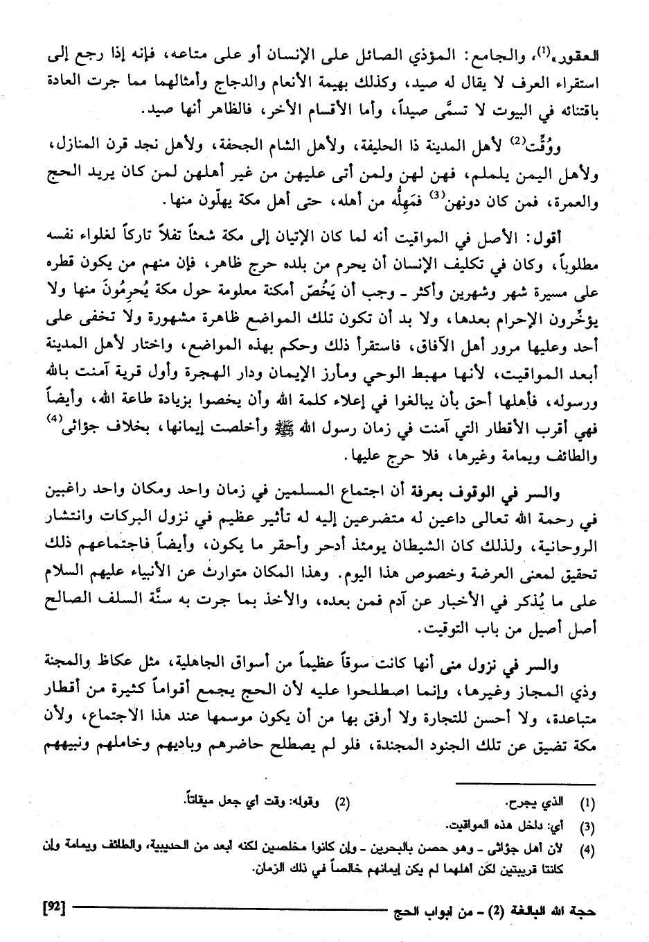 وَوقت لأهل الْمَدِينَة ذَا الحليفة، وَلأَهل الشَّام الْجحْفَة، وَلأَهل نجد قرن الْمنَازل، وَلأَهل الْيمن يَلَمْلَم فهن لَهُنَّ، وَلمن أَتَى عَلَيْهِنَّ من غير أهلهن لمن كَانَ يُرِيد الْحَج وَالْعمْرَة فَمن كَانَ دونهن فمهله من أَهله حَتَّى أهل مَكَّة يهلون مِنْهَا. أَقُول: الأَصْل فِي الْمَوَاقِيت أَنه لما كَانَ الْإِتْيَان إِلَى مَكَّة شعثا تفلا تَارِكًا لغلواء نَفسه مَطْلُوبا، وَكَانَ فِي تَكْلِيف الْإِنْسَان أَن يحرم من بَلَده حرج ظَاهر، فَإِن مِنْهُم من يكون قطره على مسيرَة شهر وشهرين وَأكْثر - وَجب أَن يخص أمكنة مَعْلُومَة حول مَكَّة يحرمُونَ مِنْهَا، وَلَا يؤخرون الْإِحْرَام بعْدهَا، وَلَا بُد أَن تكون تِلْكَ الْمَوَاضِع ظَاهِرَة مَشْهُورَة، وَلَا تخفى على أحد، وَعَلَيْهَا مُرُور أهل الْآفَاق، فاستقرا ذَلِك، وَحكم بِهَذِهِ الْمَوَاضِع، وَاخْتَارَ لأهل الْمَدِينَة أبعد الْمَوَاقِيت لِأَنَّهَا مهبط الْوَحْي ومأرز الْإِيمَان وَدَار الْهِجْرَة وَأول قَرْيَة آمَنت بِاللَّه وَرَسُوله، فأهلها أَحَق بِأَن يبالغوا فِي إعلاء كلمة الله، وَأَن يخصوا بِزِيَادَة طَاعَة الله، وَأَيْضًا فَهِيَ أقرب الأقطار الَّتِي آمَنت فِي زمَان رَسُول الله صَلَّى اللهُ عَلَيْهِ وَسَلَّمَ، وأخلصت إيمَانهَا بِخِلَاف