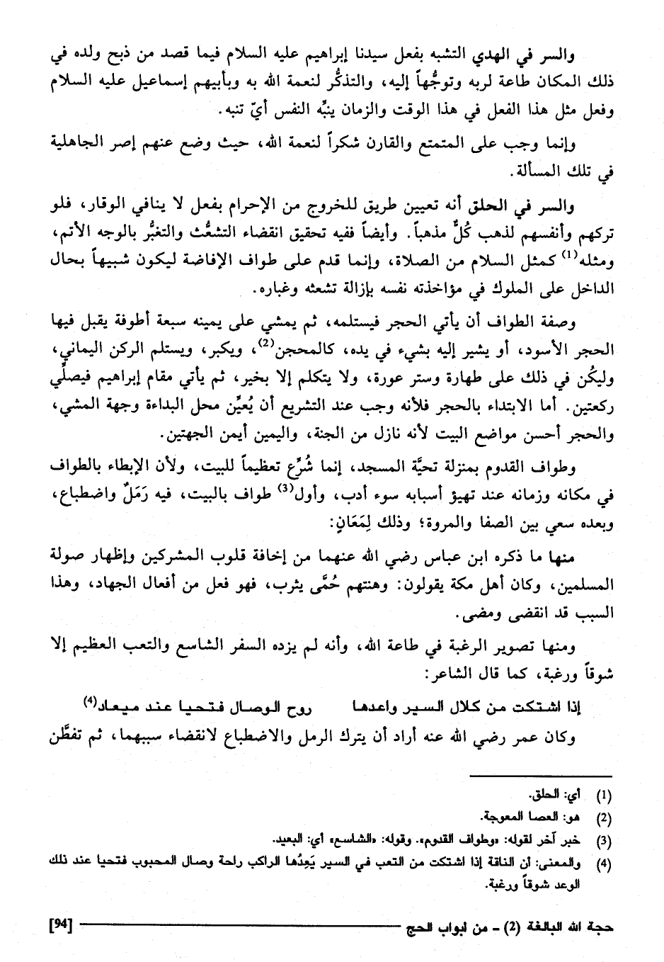 وَإِظْهَار صولة الْمُسلمين، وَكَانَ أهل مَكَّة يَقُولُونَ: وهنتهم حمى يثرب، فَهُوَ فعل من أَفعَال الْجِهَاد، وَهَذَا السَّبَب قد انْقَضى وَمضى، وَمِنْهَا تَصْوِير الرَّغْبَة فِي طَاعَة الله، وَأَنه لم يزده السّفر الشاسع والتعب الْعَظِيم إِلَّا شوقا ورغبة كَمَا قَالَ الشَّاعِر: