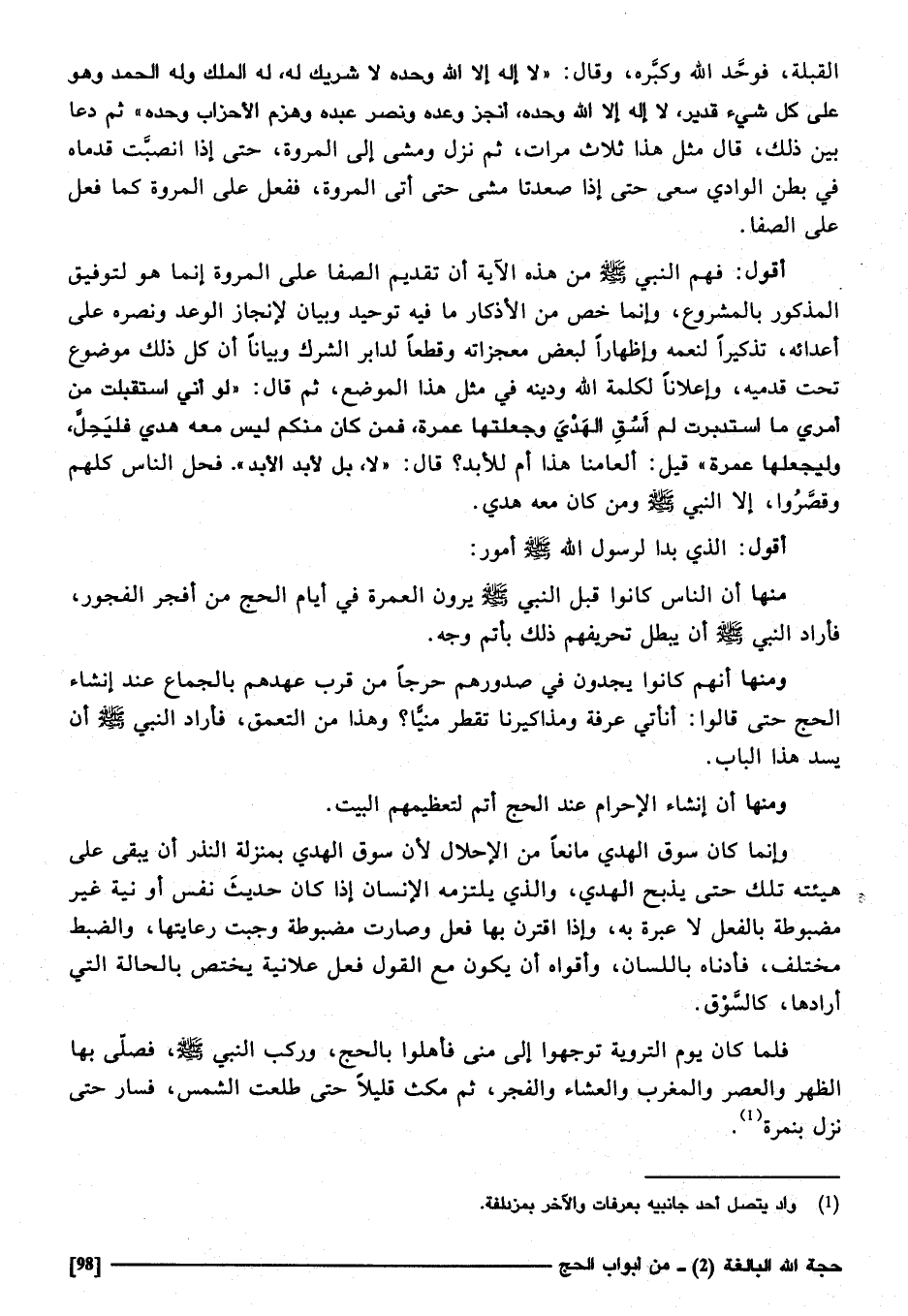 أَقُول: فهم النَّبِي صَلَّى اللهُ عَلَيْهِ وَسَلَّمَ من هَذِه الْآيَة أَن تَقْدِيم الصَّفَا على الْمَرْوَة إِنَّمَا هُوَ لتوفيق الْمَذْكُور بالمشروع، وَإِنَّمَا خص من الْأَذْكَار مَا فِيهِ تَوْحِيد وَبَيَان لإنجاز الْوَعْد وَنَصره على أعدائه تذكيرا لنعمه وإظهارا لبَعض معجزاته وقطعا لدابر الشّرك وبيانا أَن كل ذَلِك مَوْضُوع تَحت قَدَمَيْهِ وإعلانا لكلمة الله وَدينه فِي مثل هَذَا الْموضع، ثمَّ قَالَ: " لَو أَنى اسْتقْبلت من أَمْرِي مَا اسْتَدْبَرت لم أسق الْهدى وجعلتها عمْرَة، فَمن كَانَ مِنْكُم لَيْسَ مَعَه هدى فليحل، وليجعلها عمْرَة، قيل: ألعامنا هَذَا أم لِلْأَبَد. قَالَ: لَا بل لأبد الْأَبَد، فَحل النَّاس كلهم، وَقصرُوا إِلَّا النَّبِي صَلَّى اللهُ عَلَيْهِ وَسَلَّمَ، وَمن كَانَ مَعَه هدى.