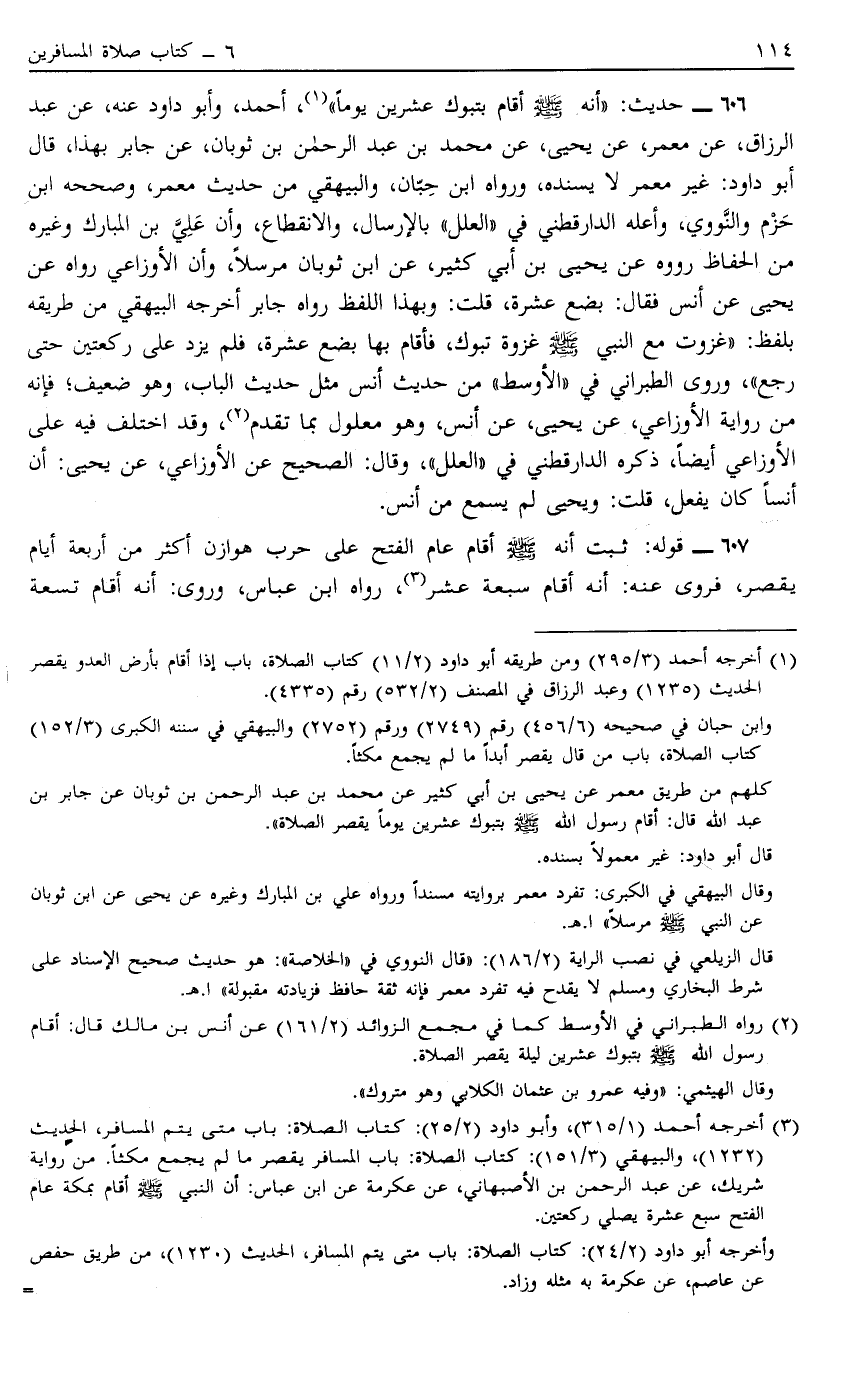 606 - حَدِيثُ أَنَّهُ صَلَّى اللَّهُ عَلَيْهِ وَسَلَّمَ أَقَامَ بِتَبُوكَ عِشْرِينَ يَوْمًا1 أَحْمَدُ وَأَبُو دَاوُد عَنْهُ عَنْ عَبْدِ الرَّزَّاقِ عَنْ مَعْمَرٍ عَنْ يَحْيَى عَنْ مُحَمَّدِ بْنِ عَبْدِ الرَّحْمَنِ بْنِ ثَوْبَانَ عَنْ جَابِرٍ بِهَذَا قَالَ أَبُو دَاوُد غَيْرُ مَعْمَرٍ لَا يُسْنِدُهُ وَرَوَاهُ ابْنُ حِبَّانَ وَالْبَيْهَقِيُّ مِنْ حَدِيثِ مَعْمَرٍ وَصَحَّحَهُ ابْنُ حَزَمٍ وَالنَّوَوِيُّ وَأَعَلَّهُ الدَّارَقُطْنِيُّ فِي الْعِلَلِ بِالْإِرْسَالِ وَالِانْقِطَاعِ وَأَنَّ عَلِيَّ بْنَ الْمُبَارَكِ وَغَيْرَهُ مِنْ الْحُفَّاظِ رَوَوْهُ عَنْ يَحْيَى بْنِ أَبِي كَثِيرٍ عَنْ ابْنِ ثَوْبَانَ مُرْسَلًا وَأَنَّ الْأَوْزَاعِيَّ رَوَاهُ عَنْ يَحْيَى عَنْ أَنَسٍ فَقَالَ بِضْعَ عَشَرَةَ قُلْت وَبِهَذَا اللَّفْظِ رَوَاهُ جَابِرٌ أَخْرَجَهُ الْبَيْهَقِيُّ مِنْ طَرِيقِهِ بِلَفْظِ غَزَوْت مَعَ النَّبِيِّ صَلَّى اللَّهُ عَلَيْهِ وَسَلَّمَ غَزْوَةَ تَبُوكَ فَأَقَامَ بِهَا بِضْعَ عَشَرَةَ فَلَمْ يَزِدْ عَلَى رَكْعَتَيْنِ حَتَّى رَجَعَ وَرَوَى الطَّبَرَانِيُّ فِي الْأَوْسَطِ مِنْ حَدِيثِ أَنَسٍ مِثْلُ حَدِيثِ الْبَابِ وَهُوَ ضَعِيفٌ فَإِنَّهُ مِنْ رِوَايَةِ الْأَوْزَاعِيِّ عَنْ يَحْيَى عَنْ أَنَسٍ وهو معلول بِمَا تَقَدَّمَ2 وَقَدْ اُخْتُلِفَ فِيهِ عَلَى الْأَوْزَاعِيِّ أَيْضًا ذَكَرَهُ الدَّارَقُطْنِيُّ فِي الْعِلَلِ وَقَالَ الصَّحِيحُ عَنْ الْأَوْزَاعِيِّ عَنْ يَحْيَى أَنَّ أَنَسًا كَانَ يَفْعَلُ قُلْت وَيَحْيَى لَمْ يَسْمَعْ مِنْ أَنَسٍ.