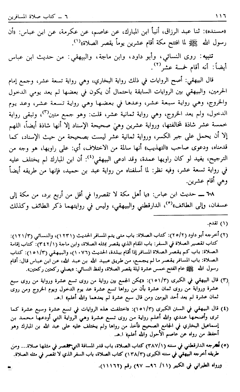 608 - حَدِيثُ ابْنِ عَبَّاسٍ "يَا أَهْلَ مَكَّةَ لَا تَقْصُرُوا فِي أَقَلَّ مِنْ أَرْبَعٍ بُرُدٍ مِنْ مَكَّةَ إلَى عُسْفَانَ وَإِلَى الطَّائِفِ"4 الدَّارَقُطْنِيُّ وَالْبَيْهَقِيُّ وَلَيْسَ فِي رِوَايَتِهِمَا ذِكْرُ الطَّائِفِ وَكَذَلِكَ