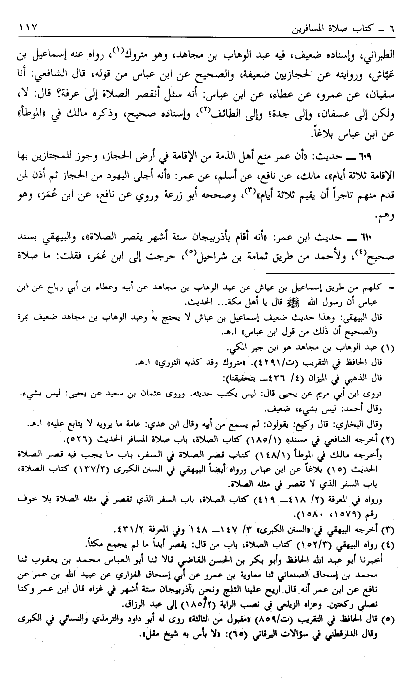 610 - حَدِيثُ ابْنِ عُمَرَ أَنَّهُ أَقَامَ بِأَذْرَبِيجَانَ سِتَّةَ أَشْهُرٍ يَقْصُرُ الصَّلَاةَ الْبَيْهَقِيّ بِسَنَدٍ صَحِيحٍ4 وَلِأَحْمَدَ مِنْ طَرِيقِ ثُمَامَةَ بْنِ شَرَاحِيلَ5 خَرَجْت إلَى ابْنِ عُمَرَ فَقُلْت مَا صَلَاةُ