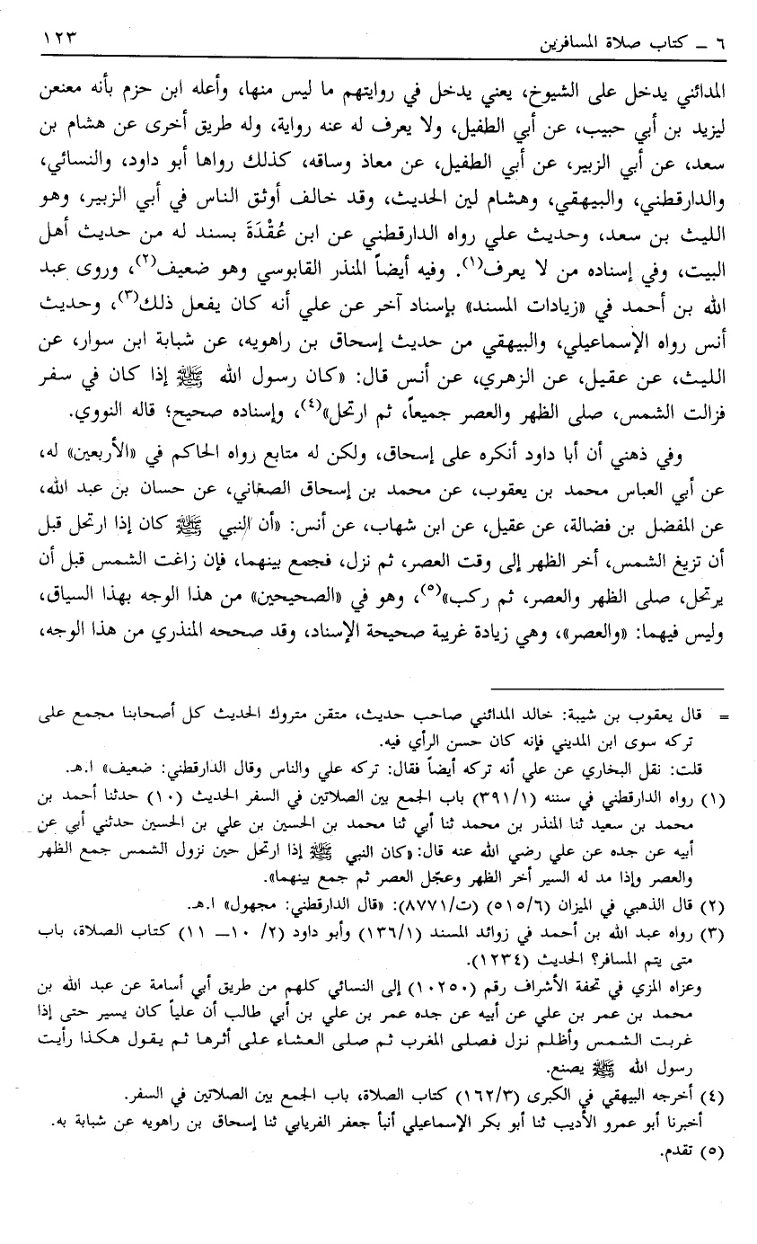 الْمَدَائِنِيُّ يُدْخِلُ عَلَى الشُّيُوخِ يَعْنِي يُدْخِلُ فِي رِوَايَتِهِمْ مَا لَيْسَ مِنْهَا وَأَعَلَّهُ ابْنُ حَزْمٍ بِأَنَّهُ مُعَنْعَنٌ لِيَزِيدَ بْنِ أَبِي حَبِيبٍ عَنْ أَبِي الطُّفَيْلِ وَلَا يُعْرَفُ لَهُ عَنْهُ رِوَايَةٌ وَلَهُ طَرِيقٌ أُخْرَى عَنْ هِشَامِ بْنِ سَعْدٍ عَنْ أَبِي الزُّبَيْرِ عَنْ أَبِي الطُّفَيْلِ عَنْ مُعَاذٍ وَسَاقَهُ كَذَلِكَ رَوَاهَا أَبُو دَاوُد وَالنَّسَائِيُّ وَالدَّارَقُطْنِيّ وَالْبَيْهَقِيُّ وَهِشَامٌ لَيِّنُ الْحَدِيثِ وَقَدْ خَالَفَ أَوْثَقَ النَّاسِ فِي أَبِي الزُّبَيْرِ وَهُوَ اللَّيْثُ بْنُ سَعْدٍ وَحَدِيثُ عَلِيٍّ رَوَاهُ الدَّارَقُطْنِيُّ عَنْ ابْنِ عُقْدَةَ بِسَنَدٍ لَهُ مِنْ حَدِيثِ أَهْلِ الْبَيْتِ وَفِي إسْنَادِهِ مَنْ لَا يُعْرَفُ1 وَفِيهِ أَيْضًا الْمُنْذِرُ الْقَابُوسِيُّ وَهُوَ ضَعِيفٌ2 وَرَوَى عَبْدُ اللَّهِ بْنُ أَحْمَدَ فِي زِيَادَاتِ الْمُسْنَدِ بِإِسْنَادٍ آخَرَ عَنْ عَلِيٍّ أَنَّهُ كَانَ يَفْعَلُ ذَلِكَ3 وَحَدِيثُ أَنَسٍ رَوَاهُ الْإِسْمَاعِيلِيُّ وَالْبَيْهَقِيُّ مِنْ حَدِيثِ إِسْحَاقَ بْنِ رَاهْوَيْهِ عَنْ شَبَابَةَ بْنِ سَوَّارٍ عَنْ اللَّيْثِ عَنْ عُقَيْلٍ عَنْ الزُّهْرِيِّ عَنْ أَنَسٍ قَالَ كَانَ رَسُولُ اللَّهِ صَلَّى اللَّهُ عَلَيْهِ وَسَلَّمَ إذَا كَانَ فِي سَفَرٍ فَزَالَتْ الشَّمْسُ صَلَّى الظُّهْرَ وَالْعَصْرَ جَمِيعًا ثُمَّ ارْتَحَلَ4 وَإِسْنَادُهُ صَحِيحٌ قَالَهُ النَّوَوِيُّ.
