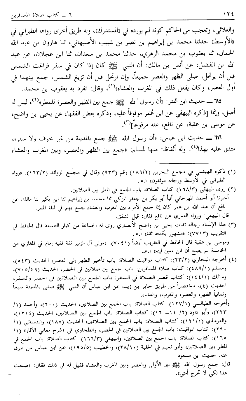 وَالْعَلَائِيُّ وَتَعَجَّبَ مِنْ الْحَاكِمِ كَوْنَهُ لَمْ يُورِدْهُ فِي الْمُسْتَدْرَكِ وَلَهُ طَرِيقٌ أُخْرَى رَوَاهَا الطَّبَرَانِيُّ فِي الْأَوْسَطِ حَدَّثَنَا مُحَمَّدُ بْنُ إبْرَاهِيمَ بْنِ نَصْرِ بْنِ شَبِيبٍ الْأَصْبَهَانِيُّ ثَنَا هَارُونُ بْنُ عَبْدِ اللَّهِ الْحَمَّالُ ثَنَا يَعْقُوبُ بْنُ مُحَمَّدٍ الزُّهْرِيُّ ثَنَا مُحَمَّدُ بْنُ سَعْدَانَ ثَنَا ابْنُ عَجْلَانَ عَنْ عَبْدِ اللَّهِ بْنِ الْفَضْلِ عَنْ أَنَسِ بْنِ مَالِكٍ أَنَّ النَّبِيَّ صَلَّى اللَّهُ عَلَيْهِ وَسَلَّمَ كَانَ إذَا كَانَ فِي سَفَرٍ فَزَاغَتْ الشَّمْسُ قَبْلَ أَنْ يَرْتَحِلَ صَلَّى الظُّهْرَ وَالْعَصْرَ جَمِيعًا وَإِنْ ارْتَحَلَ قَبْلَ أَنْ تَزِيغَ الشَّمْسُ جَمَعَ بَيْنَهُمَا فِي أَوَّلِ الْعَصْرِ وَكَانَ يَفْعَلُ ذَلِكَ فِي الْمَغْرِبِ وَالْعِشَاءِ1 وَقَالَ تَفَرَّدَ بِهِ يَعْقُوبُ بْنُ مُحَمَّدٍ.