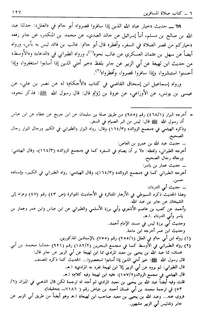 619 - حَدِيثُ خِيَارُ عِبَادِ الله الذين إذَا سَافَرُوا قَصَرُوا أَبُو حَاتِمٍ فِي الْعِلَلِ حَدَّثَنَا عَبْدُ اللَّهِ بْنُ صَالِحٍ بْنُ مُسْلِمٍ أَنْبَأَ إسْرَائِيلُ عَنْ خَالِدٍ الْعَبْدِيِّ عَنْ مُحَمَّدِ بْنِ الْمُنْكَدِرِ عَنْ جَابِرٍ رَفَعَهُ خِيَارُكُمْ مَنْ قَصَرَ الصَّلَاةَ فِي السَّفَرِ وَأَفْطَرَ قَالَ أَبُو حَاتِمٍ غَالِبُ بْنُ فَائِدٍ لَيْسَ بِهِ بَأْسٌ وَرَوَاهُ أَيْضًا عَنْ سَهْلِ بْنِ عُثْمَانَ الْعَسْكَرِيِّ عَنْ غَالِبٍ نَحْوُهُ1 وَرَوَاهُ الطَّبَرَانِيُّ فِي الدُّعَاءِ وَالْأَوْسَطِ مِنْ حَدِيثِ ابْنِ لَهِيعَةَ عَنْ أَبِي الزُّبَيْرِ عَنْ جَابِرٍ بِلَفْظِ "خَيْرُ أمتي الذين إذا أساؤا اسْتَغْفَرُوا وَإِذَا أَحْسَنُوا اسْتَبْشَرُوا وَإِذَا سَافَرُوا قَصَرُوا وَأَفْطَرُوا" 2.