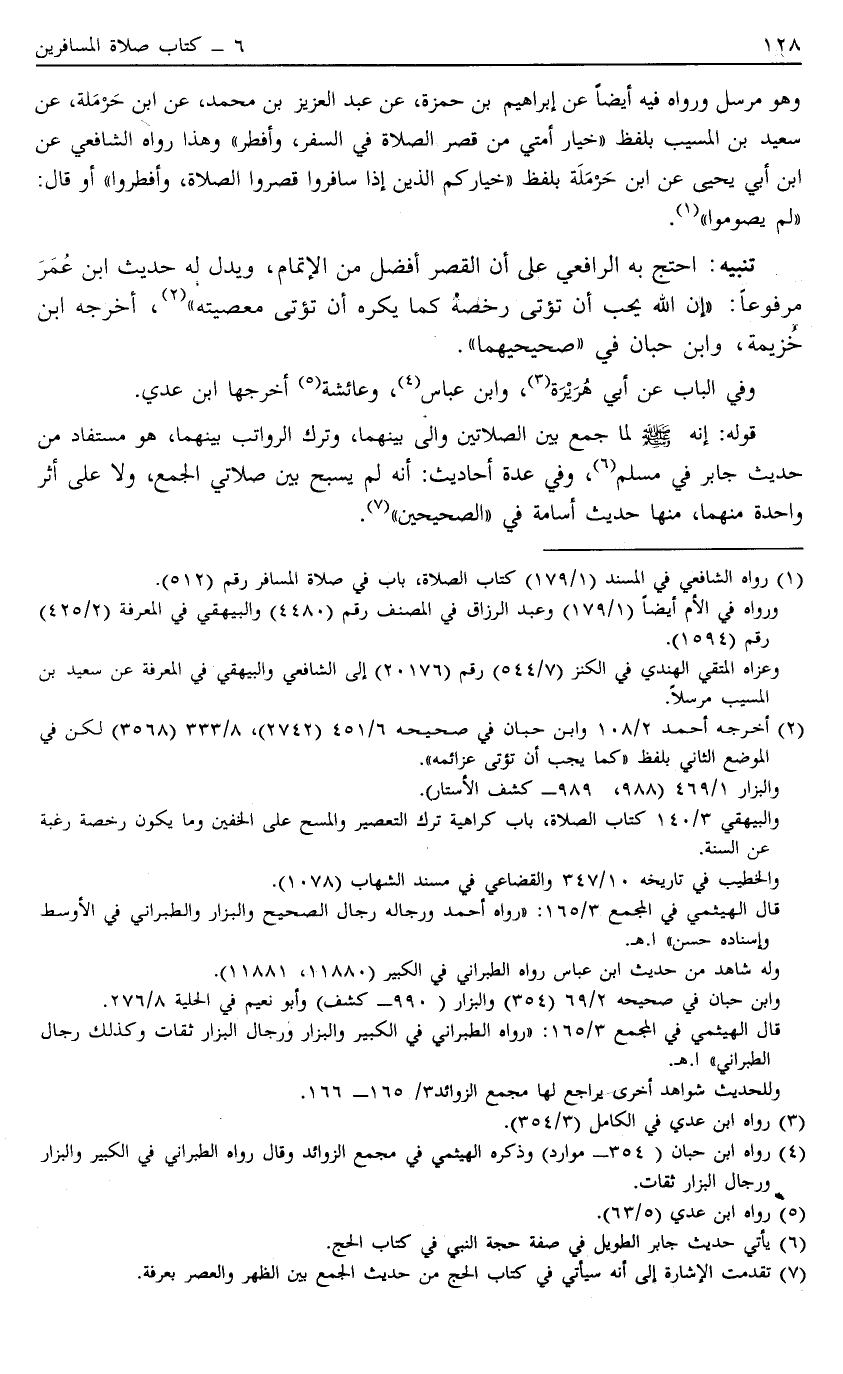 تَنْبِيهٌ احْتَجَّ بِهِ الرَّافِعِيُّ عَلَى أَنَّ الْقَصْرَ أَفْضَلُ مِنْ الْإِتْمَامِ وَيَدُلُّ لَهُ حَدِيثُ ابْنِ عُمَرَ مَرْفُوعًا "إنَّ اللَّهَ يُحِبُّ أَنْ تُؤْتَى رُخَصُهُ كَمَا يَكْرَهُ أَنْ تُؤْتَى مَعْصِيَتُهُ" 2 أَخْرَجَهُ ابْنُ خُزَيْمَةَ وَابْنُ حِبَّانَ فِي "صَحِيحَيْهِمَا".